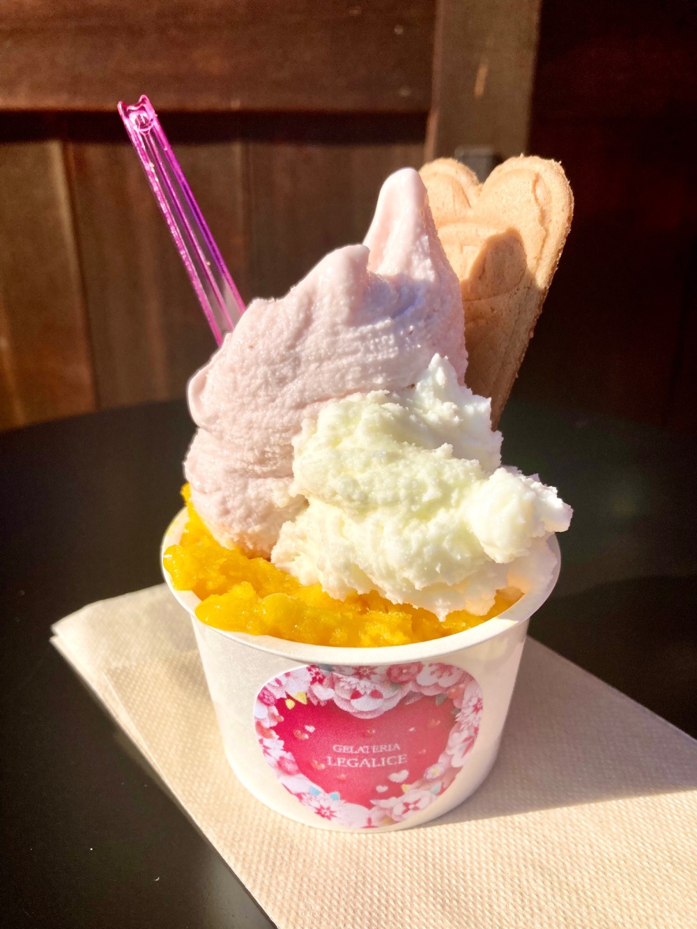 公園内を散策がてら立ち寄って欲しいのが、イタリアンジェラートのお店「GELATERIA LEGALICE 里山」ここのジェラートはBuono!ラブリーな店内には映えスポットもあり、思わず写真を撮りたくなります。犬は店内に入れませんが、テラス席や園内で食べるのはOK!