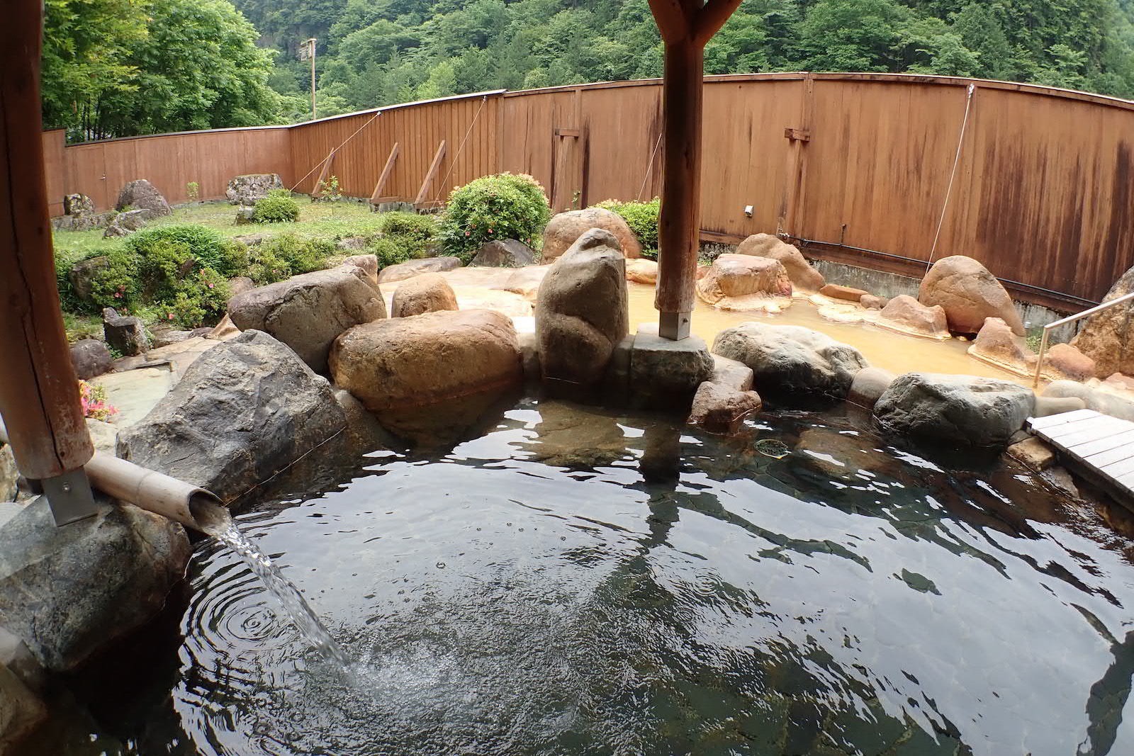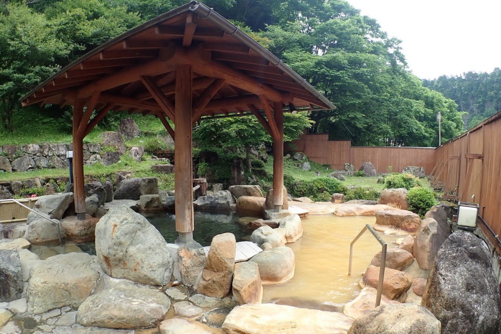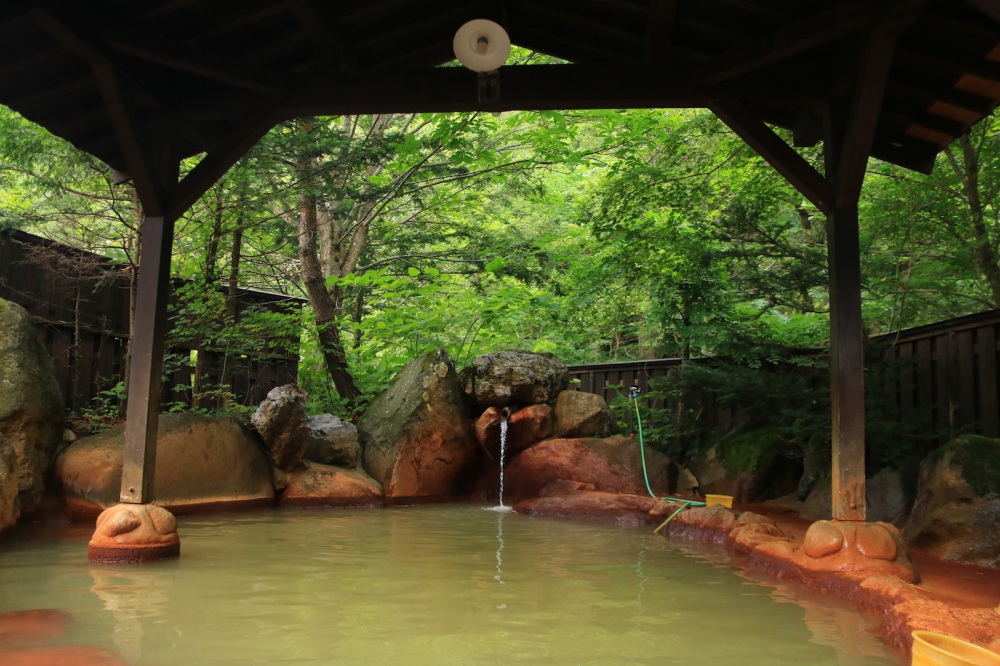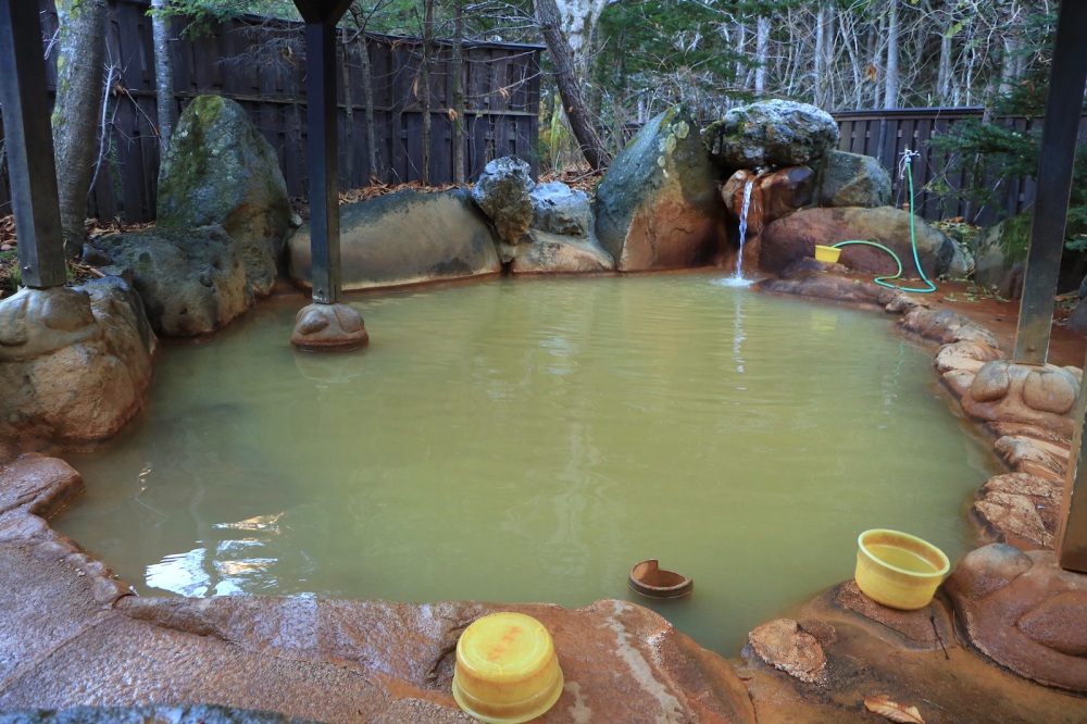 泉質は炭酸水素塩泉(ナトリウム-炭酸水素塩・塩化物泉)。かすかに濁り湯を呈しており、鉄分の香りを感じます。とろとろとした気持ちの良い肌触りです。夏は森林浴、冬は雪見露天が楽しめるのも魅力の一つ。