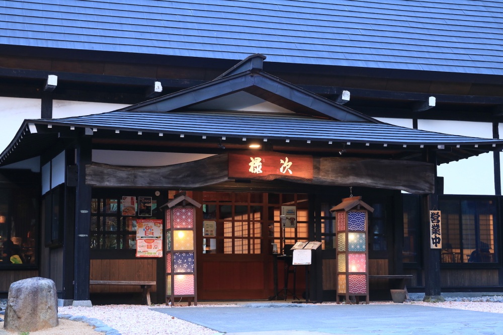 平湯民俗館の奥には、お食事処「禄次ROKUJI」が位置しています。以前は、合掌造りの「旧高桑家」で営業していましたが、2019年に敷地奥の古民家をリノベーションして新しくオープンしました。