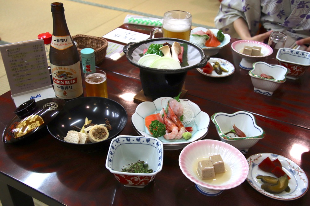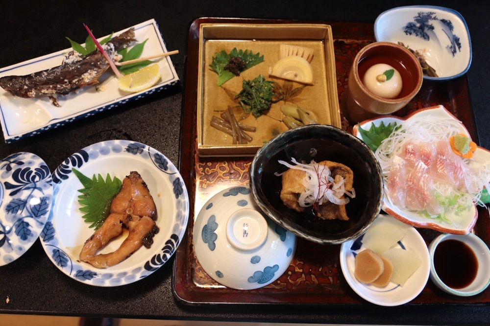 渡合温泉らしい温かなおもてなしは、提供していただける豪華なお料理にもよく表れています。天然食材盛りだくさんの前菜の後には、川魚の塩焼き、顔の大きさぐらいあるわらじ五平餅や、山菜の天ぷらまで食べきれないボリュームです。