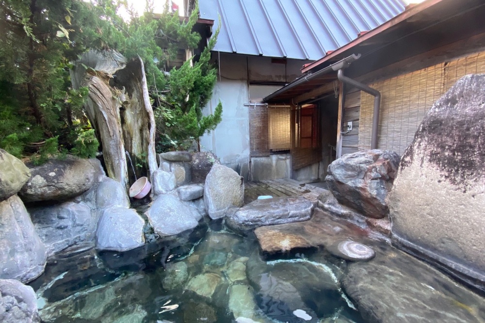 「いで湯山水」は、長きにわたり愛される老舗の温泉民宿。野趣ある岩露天風呂を有しており、ひなびた秘湯ならではの風情が感じられます。少し熱めの内湯は、数分浸かっているだけで、身体の芯からポカポカに。