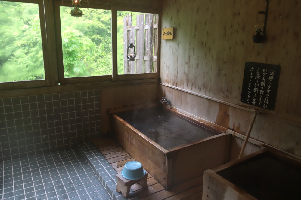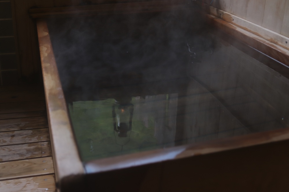 温泉と山の湧き水を入れた二つの浴槽があり、香りの良い高野槙(こうやまき)で造られています。泉質はナトリウム – 塩化物・炭酸水素塩冷鉱泉。肌に染み渡っていくような繊細な肌触りが特徴です。