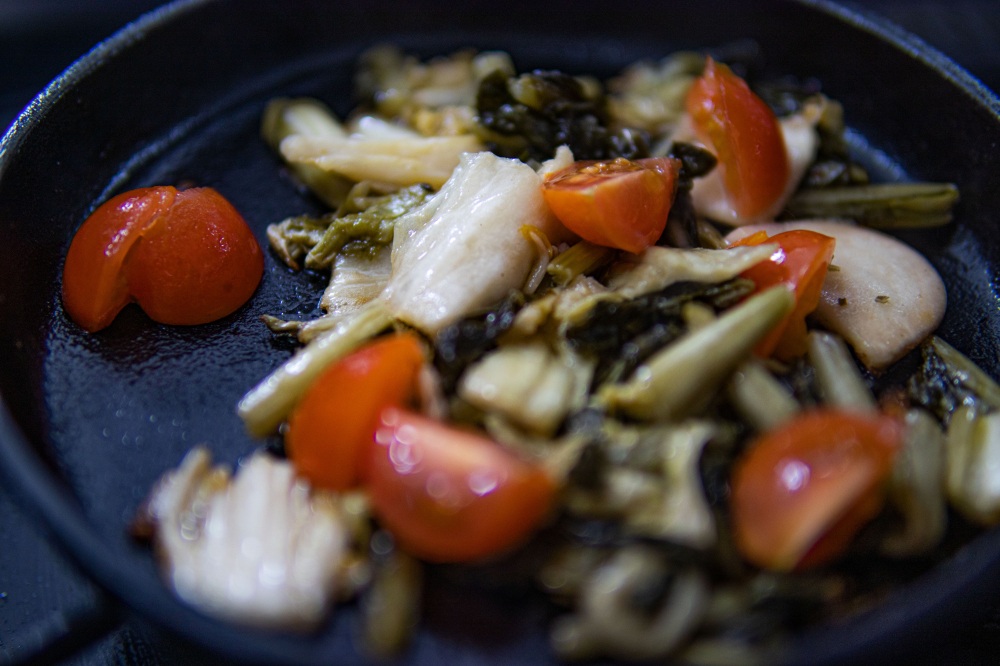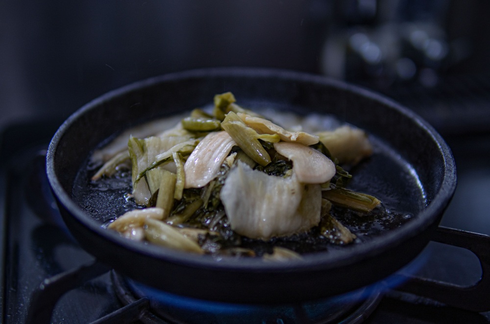 2.水気を絞った切り漬けをよく炒める