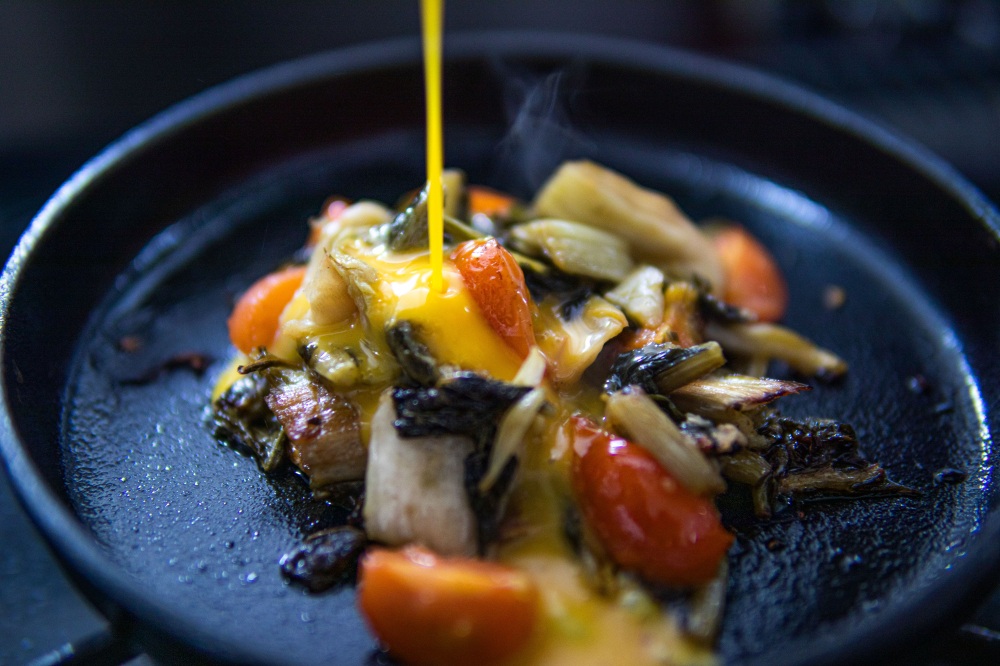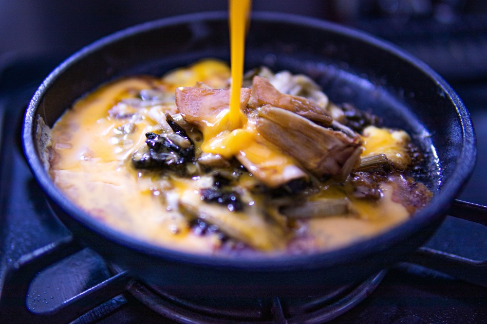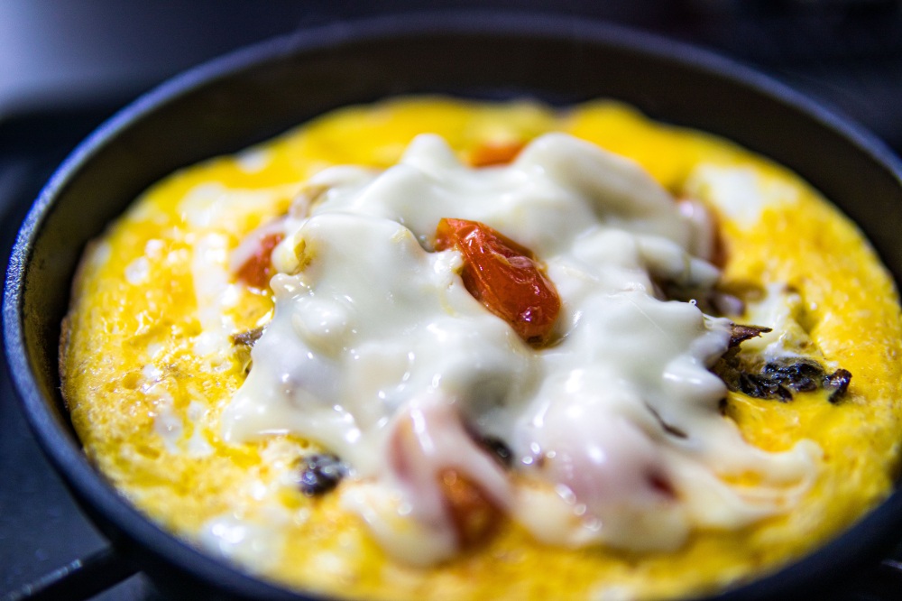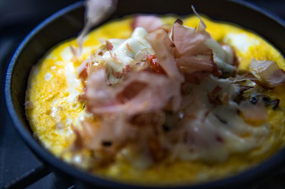 4.溶き卵をかけ、チーズを乗せる