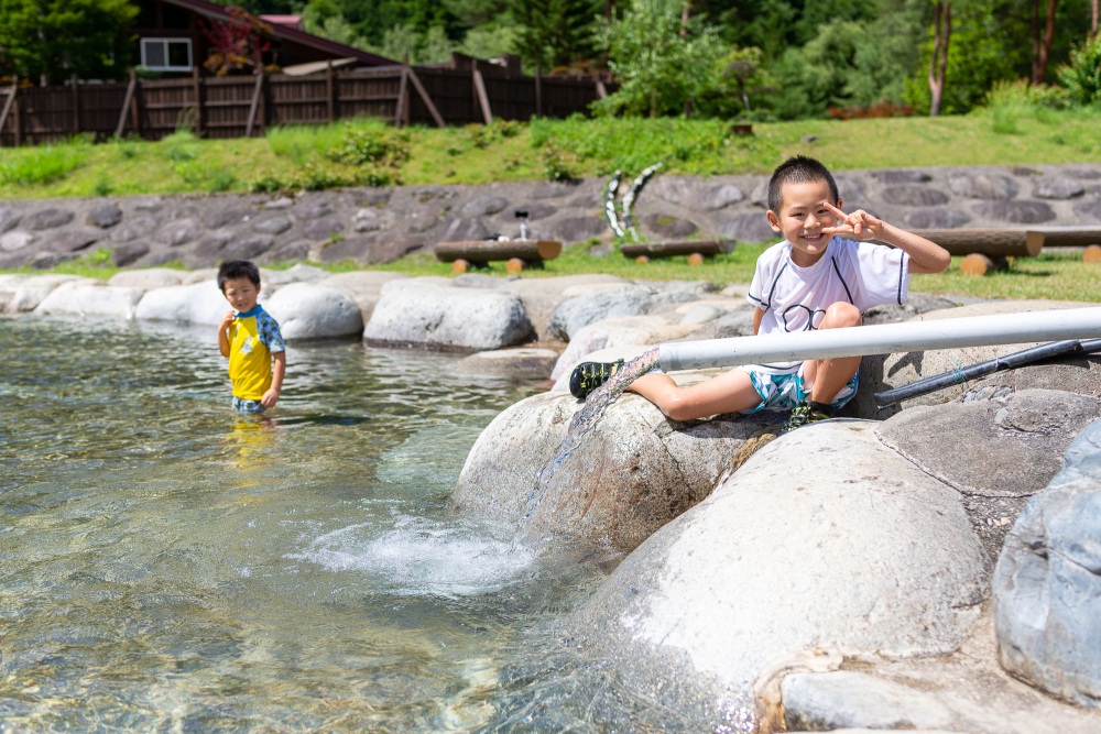 水遊び場は驚くほどの透明度!水遊びでお子さんの体が冷えても、徒歩30秒程度で温かい露天風呂があるため安心です。「水遊び→露天風呂→水遊び」のループで1日中遊んでしまうかもしれませんね。