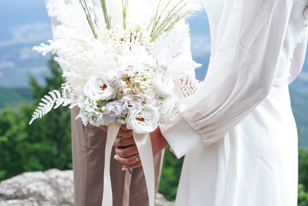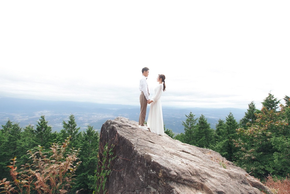 そんな美しい景色の見える山頂で、幻想的なウエディングフォトを残したいというカップルさんもたくさんいらっしゃいます。白く霞んだ雲と淡い空に溶けてしまいそうなカップルさんの自然と調和したウエディング姿を、とても美しく写真に残すことができます。
