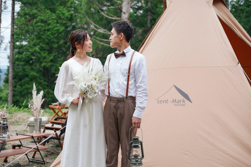 テントの前でウエディングの装いや装飾を施して、ウエディングフォトを残すカップルさんが増えています。
