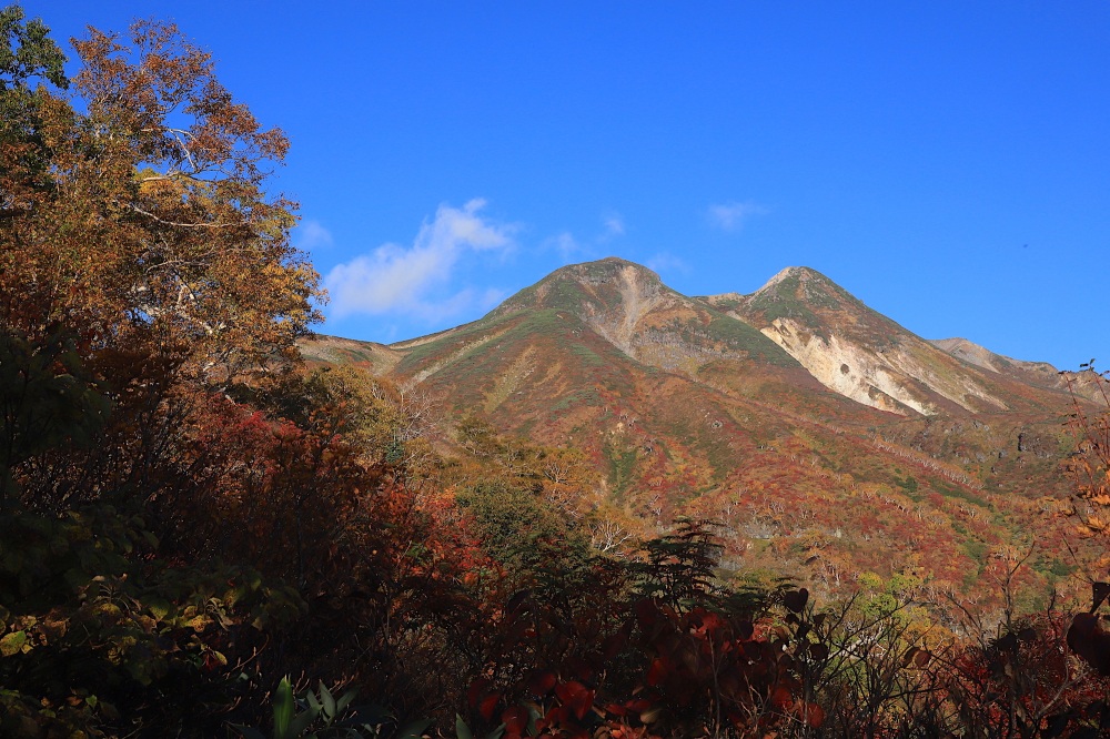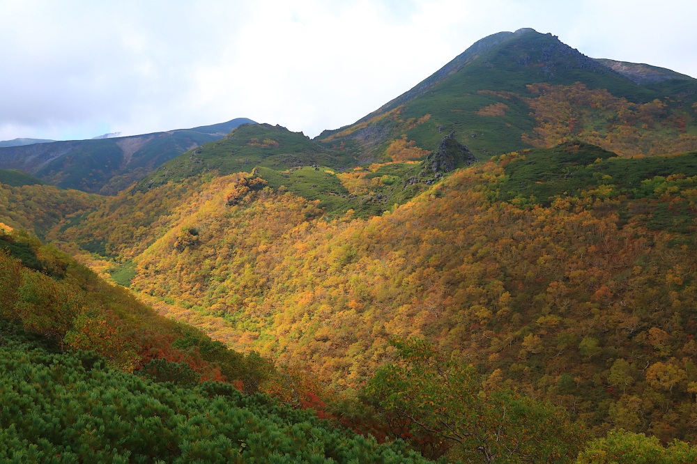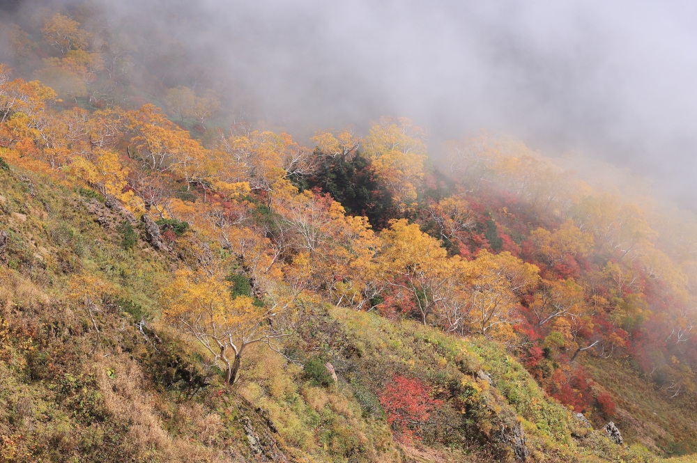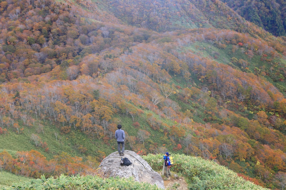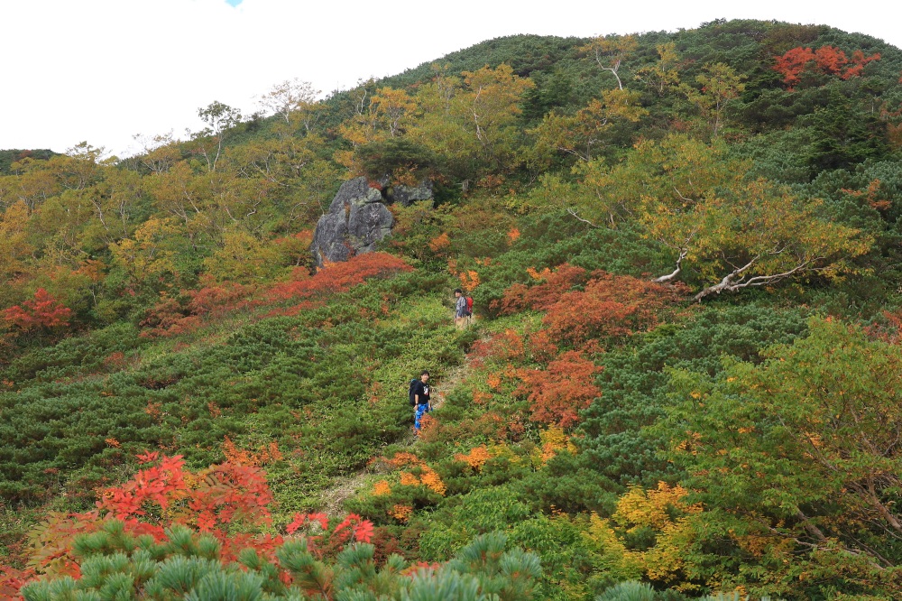 5〜6合目の”おたけり坂”を越えると、紅葉の稜線歩きが始まります。ここからがフォトジェニックです。ダケカンバを中心として、山全体がオレンジ色に染まっていきます。山頂手前の母御石(ははごいし)が撮影ポイントです。
