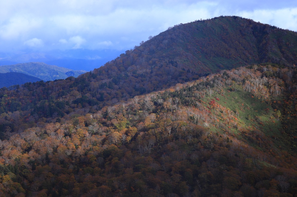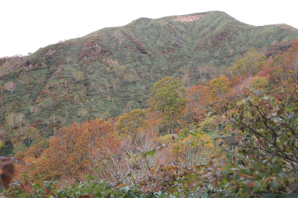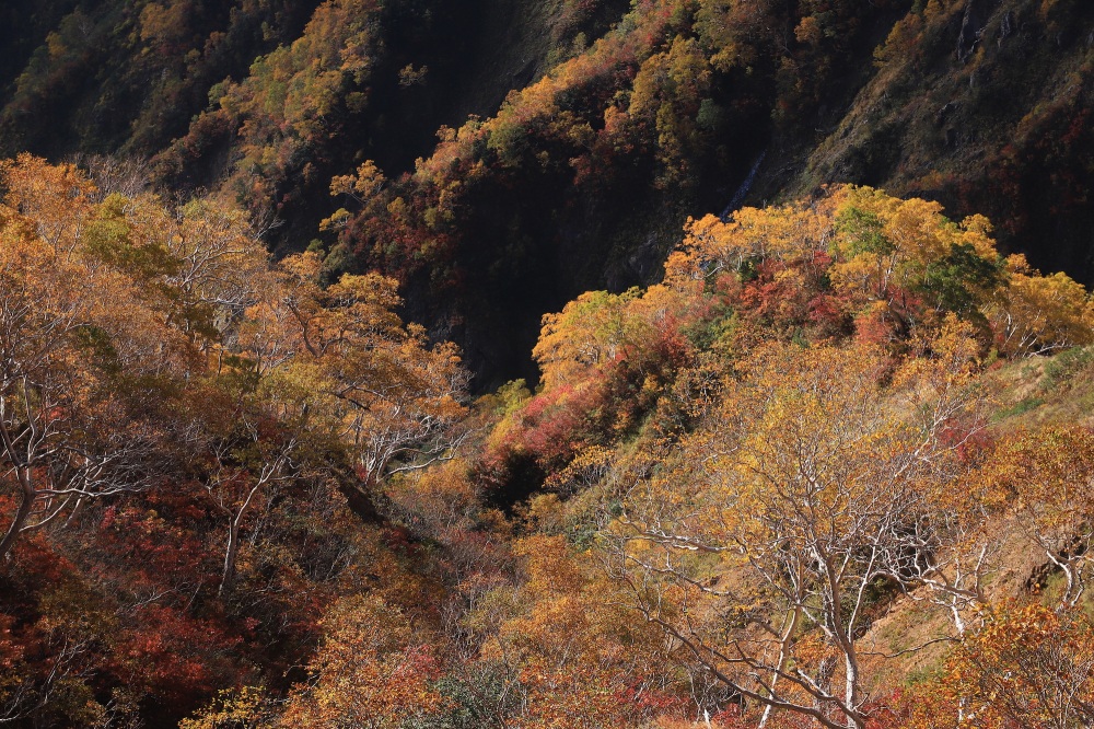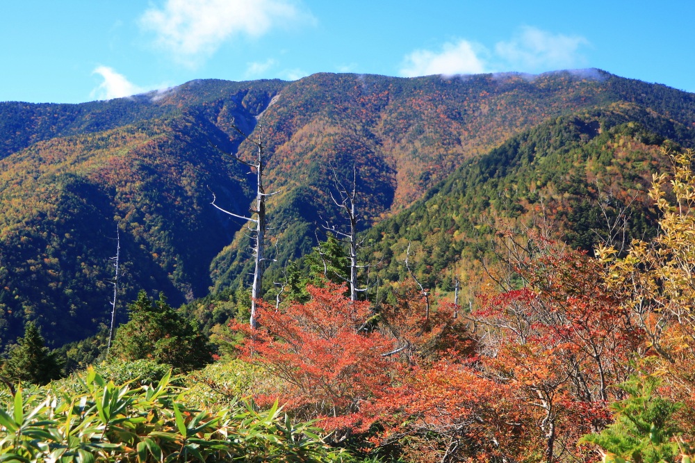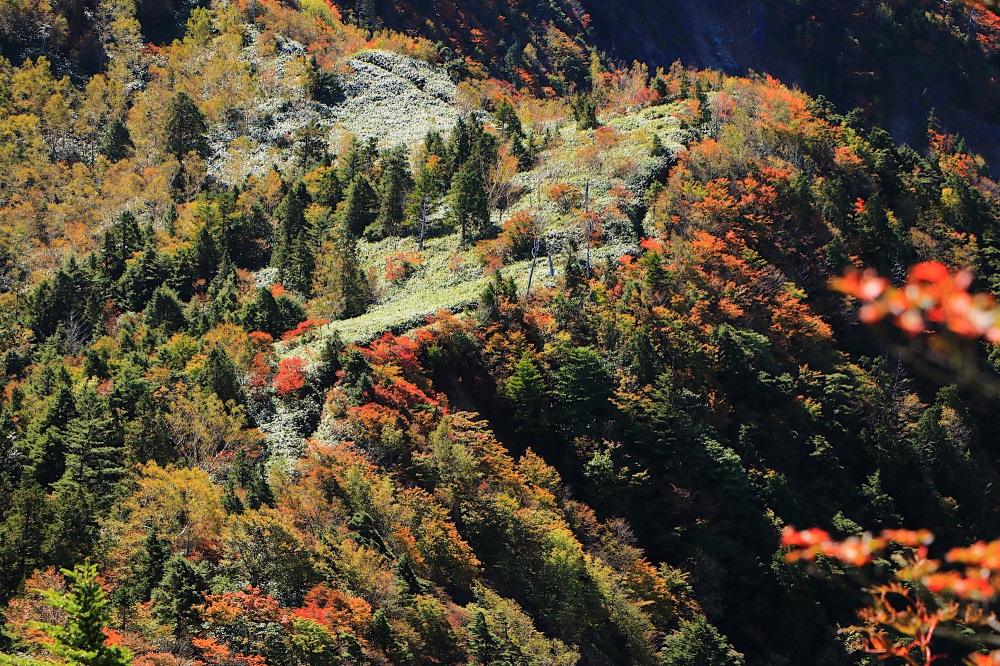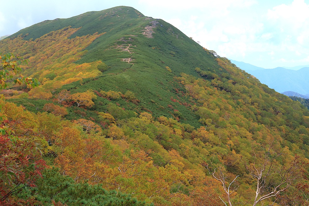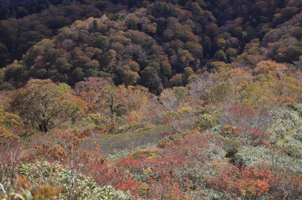その理由は、深い樹林帯を通り過ぎて、途中の大倉山(標高2,038m)周辺まで至ると分かるはず。何とそこには、山肌を覆い尽くす紅葉の絶景が待っています。
