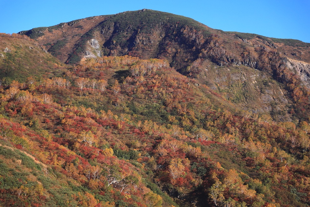 例年紅葉が見られるのは10月上旬から。10月下旬へ移行するにつれて、山頂から山腹にかけて紅葉が降りてきます。山全体がパッチワークの装いで、まるで風景画のような凛とした美しさを放ちます。