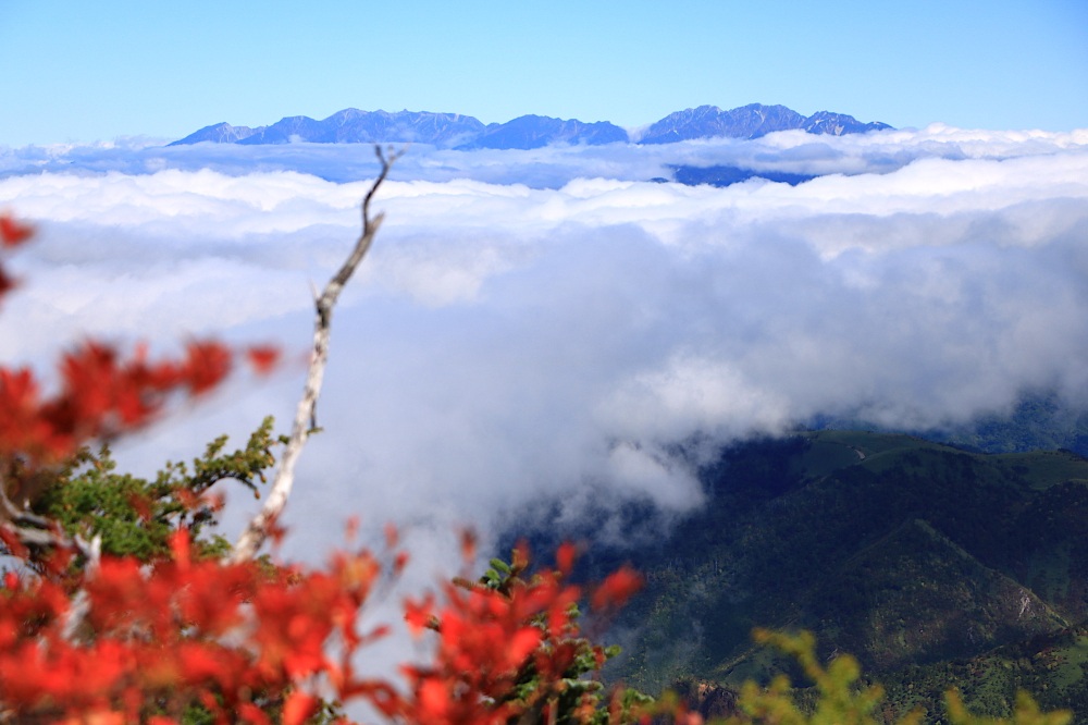 道中、陽光に照らされて、紅葉が宝石のように輝く稜線を進む道のりは、秋らしい趣が抜群!山頂には中央アルプスと紅葉の共演が待ち、運が良ければ雄大な雲海が広がります。遠く御嶽山(おんたけさん、標高3,067m)や富士山(3,776m)の山容が眺められることも。