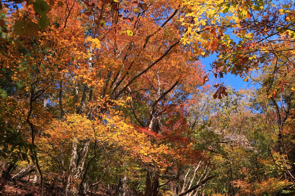 10月中旬には山頂周辺、11月になると前半の登山道まで紅葉が降りてきて、格別に美しい登山を楽しめます。ブナの回廊と呼びたくなるほど、広葉樹林が密集しており、色鮮やかな奥美濃の別天地です。