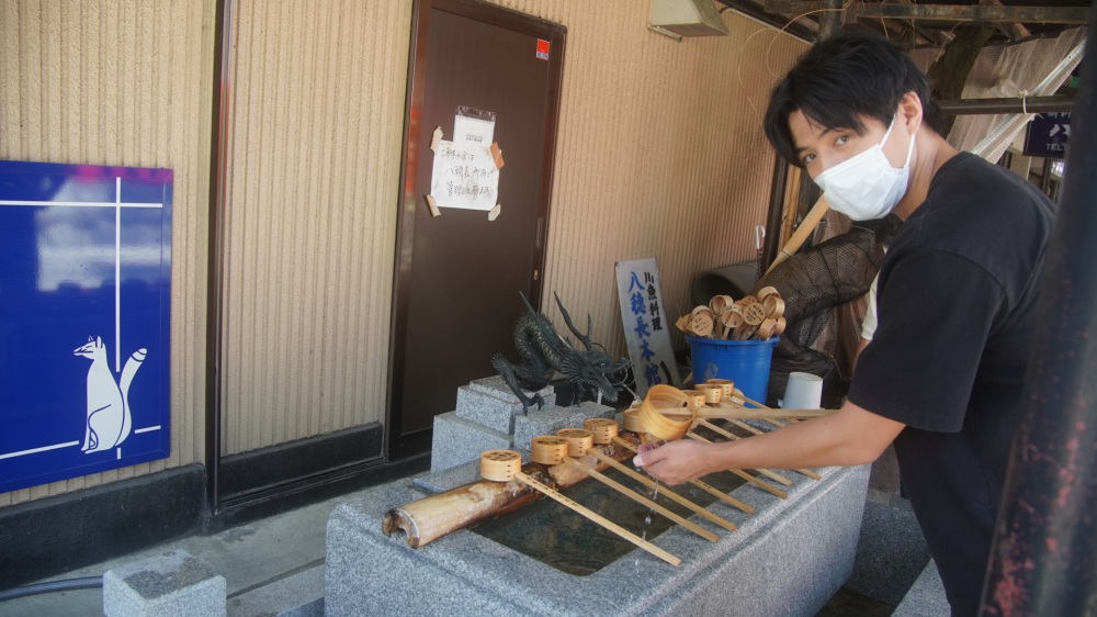 鳥居をくぐる時に一礼し、手水で身を清めます。少し進み、稲荷神のお使いである狐に奉納するための油揚げとろうそくを購入。燈明場でろうそくを立てて献灯します。
