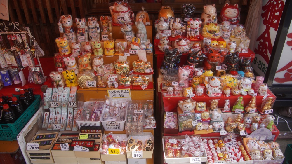 参道に戻れば、お店に金運アップグッズも並んでいます。熊手や招き猫、カエルなど、カラフルで見てるだけでも楽しくなる、日本ならではの金運グッズがずらり。