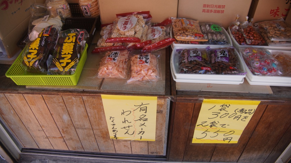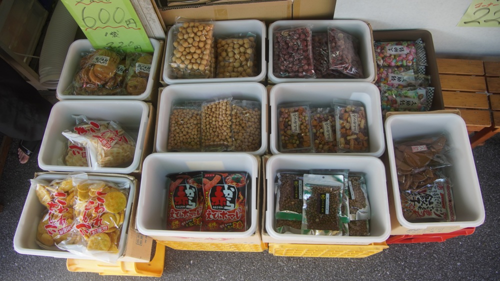 そしてちょっと懐かしい、昔ながらのお菓子を販売する店も数軒ありました。その中に、割れてしまったりした規格外のあられを販売するお店が。有名なお菓子メーカーのあられで、見たことのある商品がいくつも並んでいました。お値段は正規商品より安く、中身もたくさん入っているのでお買い得ですね!