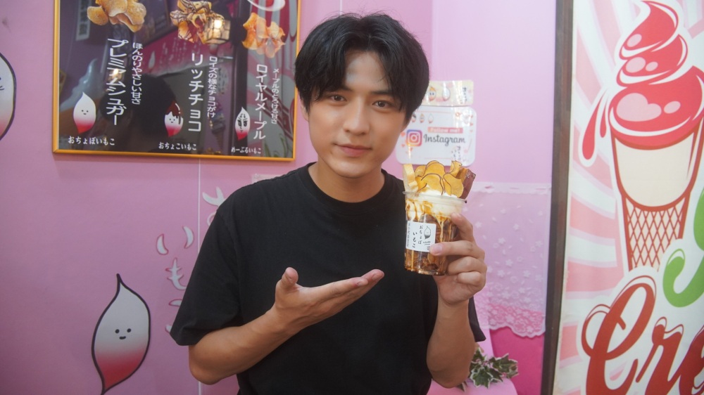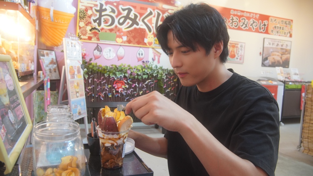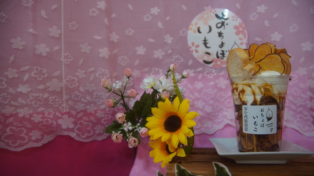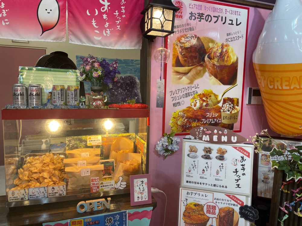 おみやげ処にて、お芋のブリュレがパフェにトッピングされ、しかも好きなだけ”追いチップス”ができるお店を発見。ワークショップ気分で楽しくなり、ついついチップスをたくさん乗せてしましました!映え写真用の撮影スポットや、座って食べられるように椅子も置いてありました。