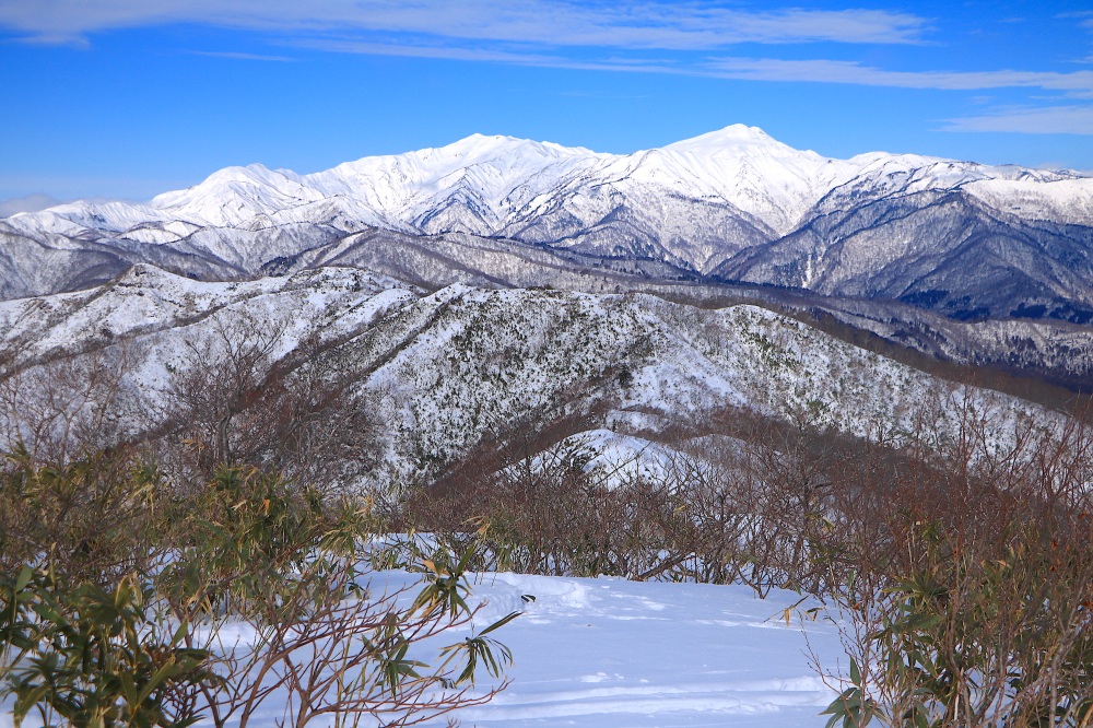 登山道は飛騨市山之村キャンプ場から。往復4時間前後と負荷も高くなく、登山者も多くないため、静かな雪山歩きを楽しめるのが魅力です。