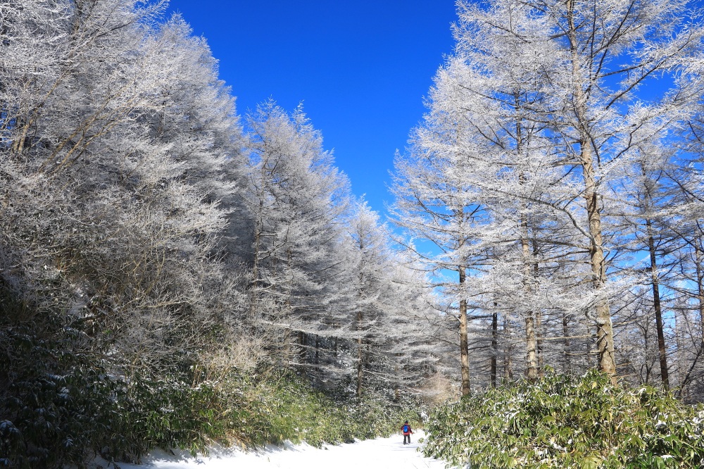 山頂直下には、カラマツ霧氷の森が形成されています。見上げれば、頭上を覆い尽くすほどの”霧氷の天井”。まさに雪山が作り上げる絵画的風景です。