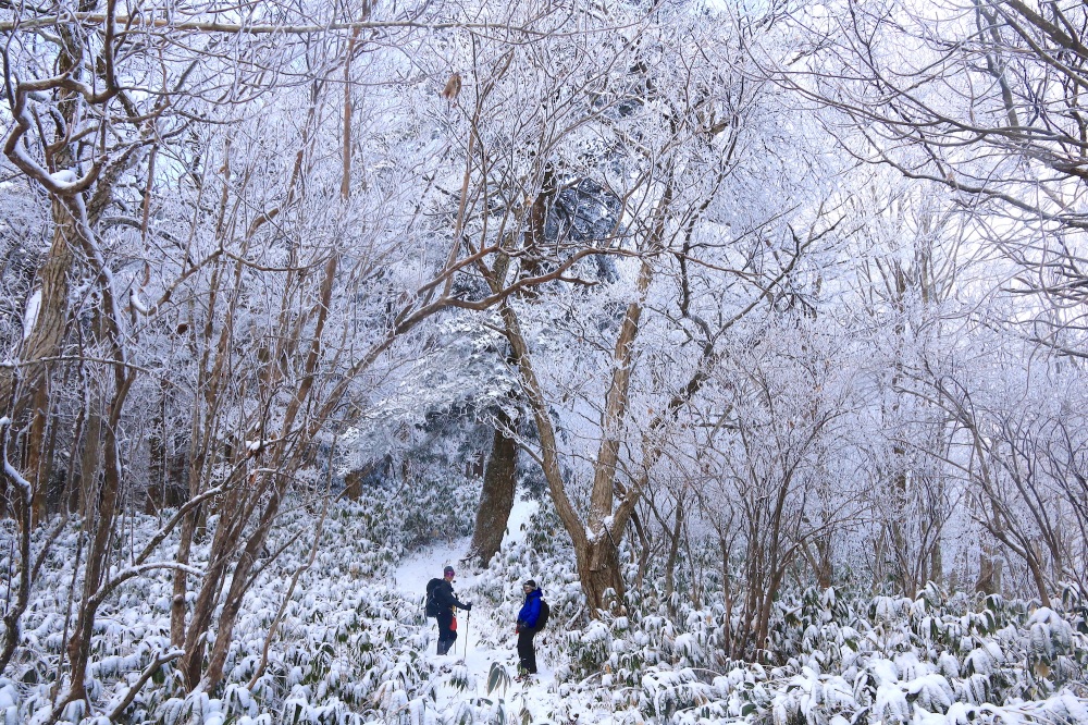 冬の飛騨地方の山は晴れることが珍しいですが、気候条件が揃えば、霧氷のトンネルを歩く非日常な登山が楽しめます。