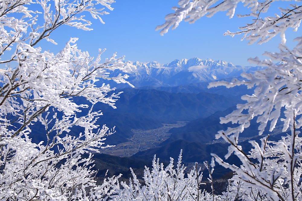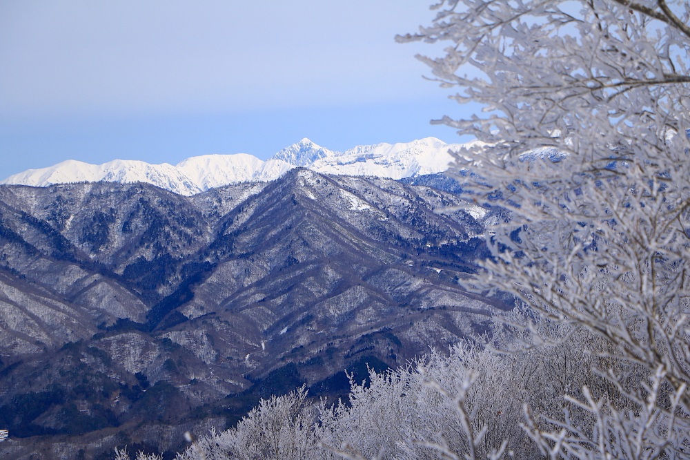 山頂周辺へ至ると、北アルプス峰と霧氷の共演を楽しめます。ダイナミックかつ引き込まれるような青と白の景色は、思わず息を呑む美しさです。