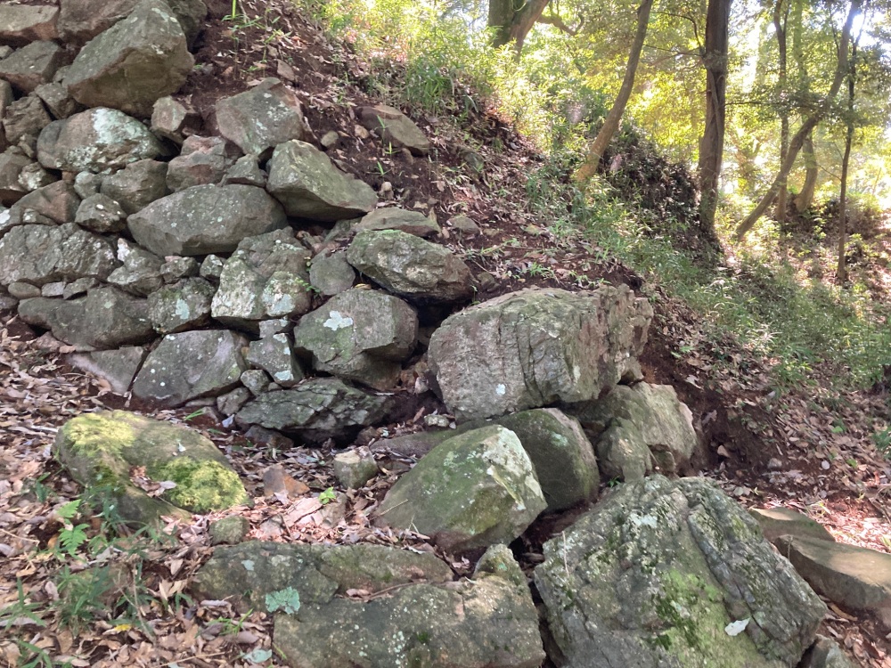 また、大手桝形の正面は石垣だったそうですが、当時、この勾配では下から上まで石垣を積むのは難しかったようで、何段かの石垣を作りその間に通路を設け、下から見ると、まるで一面の石垣に見えるような工夫をされていたそうで、所々にその面影を残す石垣が残っていました。なんて素晴らしいアイディアなんでしょう。敵はこの四角い形をした出入り口、桝形虎口に入ると前面の石垣に圧倒され、三方から攻撃されるわけですから、たまったもんじゃないですよね〜。
