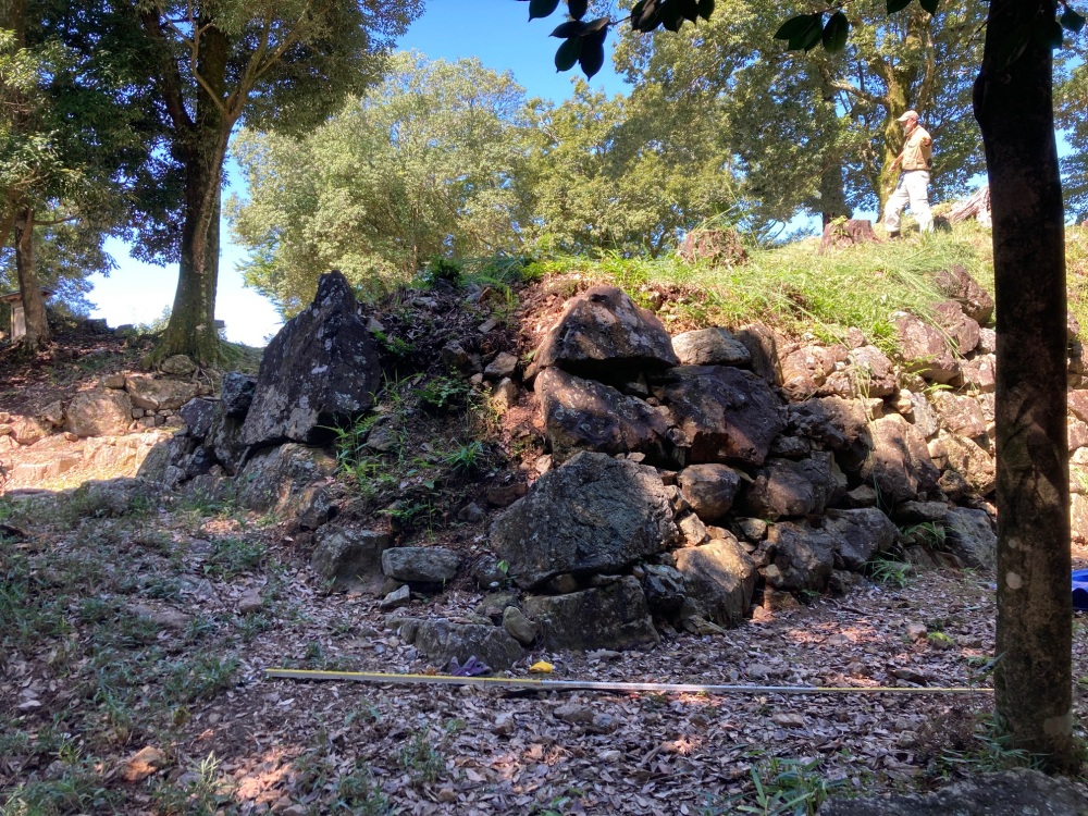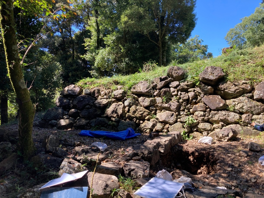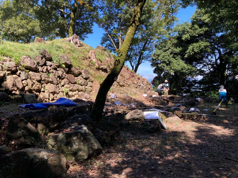 本丸の東隣に位置している曲輪(くるわ)では、自然岩盤を真ん中に、左右で積み方の違う石垣を発見!向かって右の石垣は、小ぶりの石が細々と積まれているのに比べ、左の方は、長方形の大ぶりの石が目地を揃えて積まれています。長沼さんいわく、大ぶりの石垣が積まれている方は天正後期(1586〜1591年)から後のもので、小ぶりの石積みはそれよりも前とのことで、時代によって積み方が違う石垣から土木技術の進化も見てとれます。また、ここには謎の石で囲った場所があり、これが井戸代わりの集水桝、水を溜め込むプールのようなものなのではないかとのことで、発掘調査が行われていました。