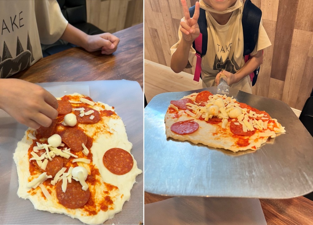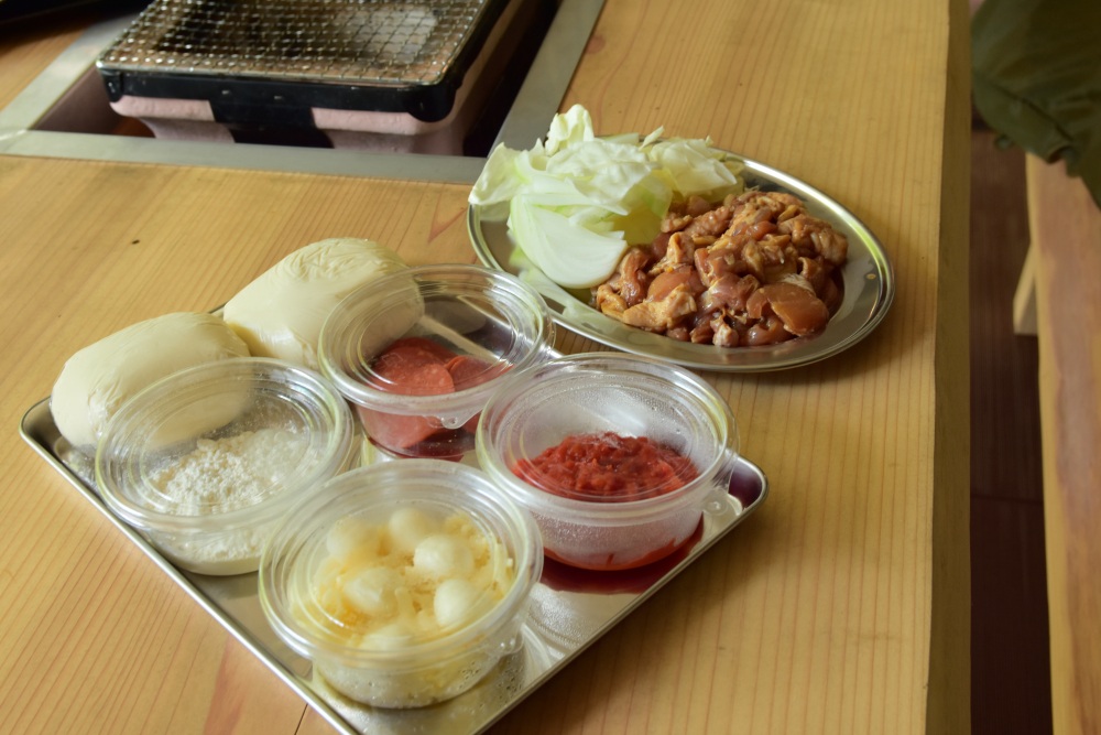 オプションでピザセットを注文すれば、ピザ生地や具材が2枚分用意してもらえるので、その場で作って食べることができます。子ども達と一緒に作って焼くのも簡単にできて、おすすめの体験です。