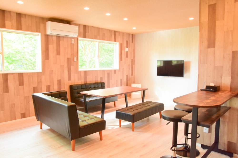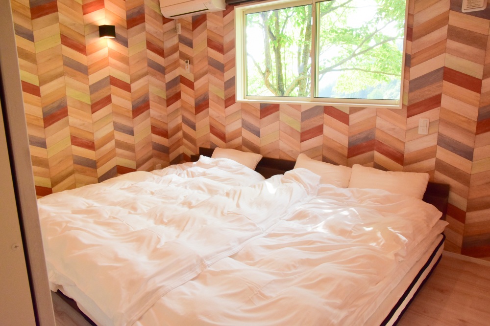 コテージ内にはリビングやキッチン、ベッドルームも完備されています。広々とした造りで、出来て間もないので全てがピカピカで快適そのもの!