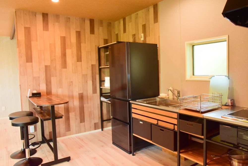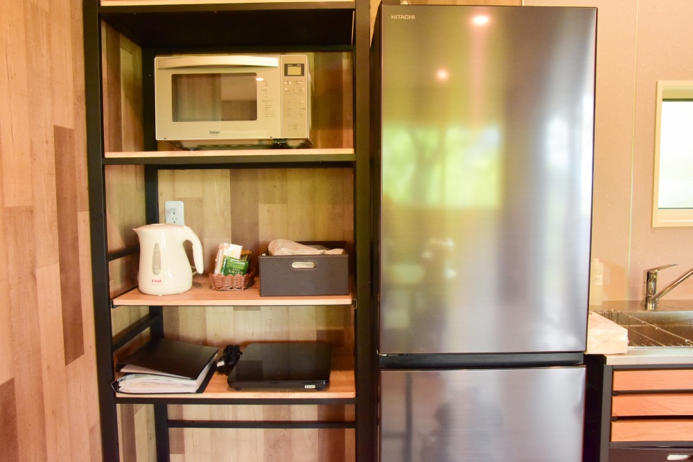 きれいなキッチンが付いているのも嬉しいポイントです。IH式の電気コンロに大きな冷蔵庫、電子レンジなどの家電もあるので、一通りの料理をすることができます。