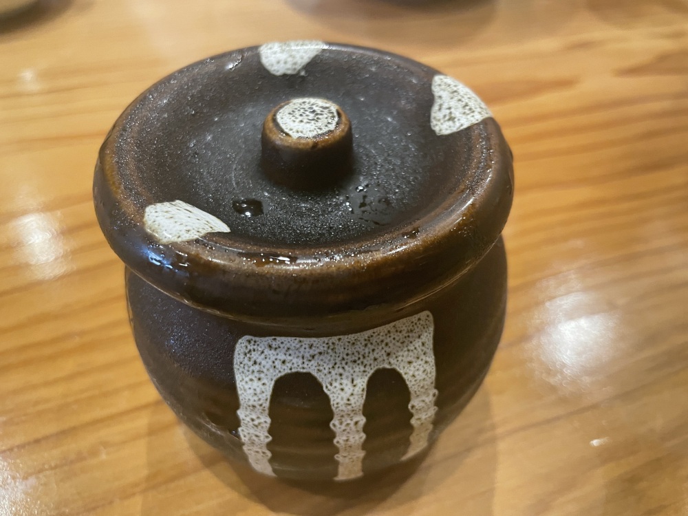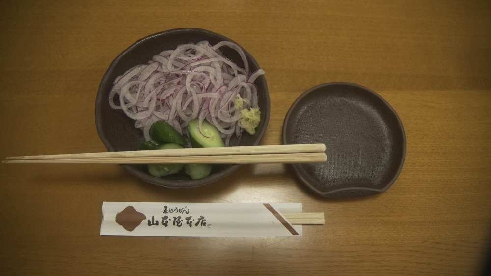 何といってもこの漬物が名物ですよね。注文してないのに出てくるなんてスゴイ!オニオンスライスにキュウリの漬物、横にはおろし生姜が添えられていました。「こちらの醤油でお召し上がりください」とおススメされた醤油が、またおいしい。出汁がきいてて合う!味噌煮込みうどんとの相性の良さに感動しました。