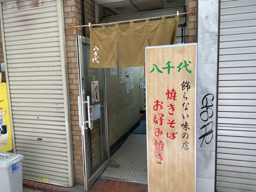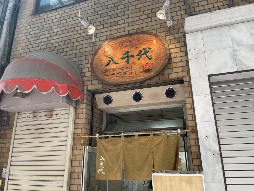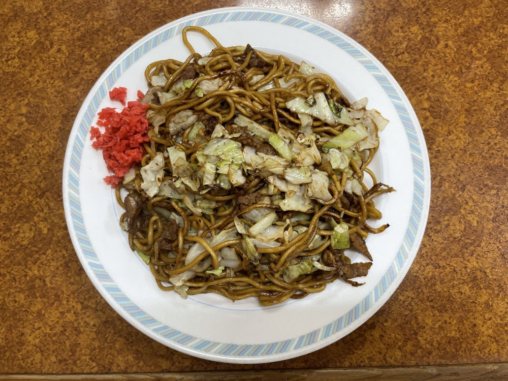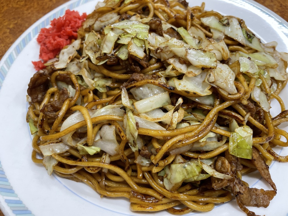 「八千代」の焼きそばは、少し太めなソース焼きそば。豚肉、イカ、ミックスと中に入れる具が選べます。目玉焼きのせがとてもおいしいです。