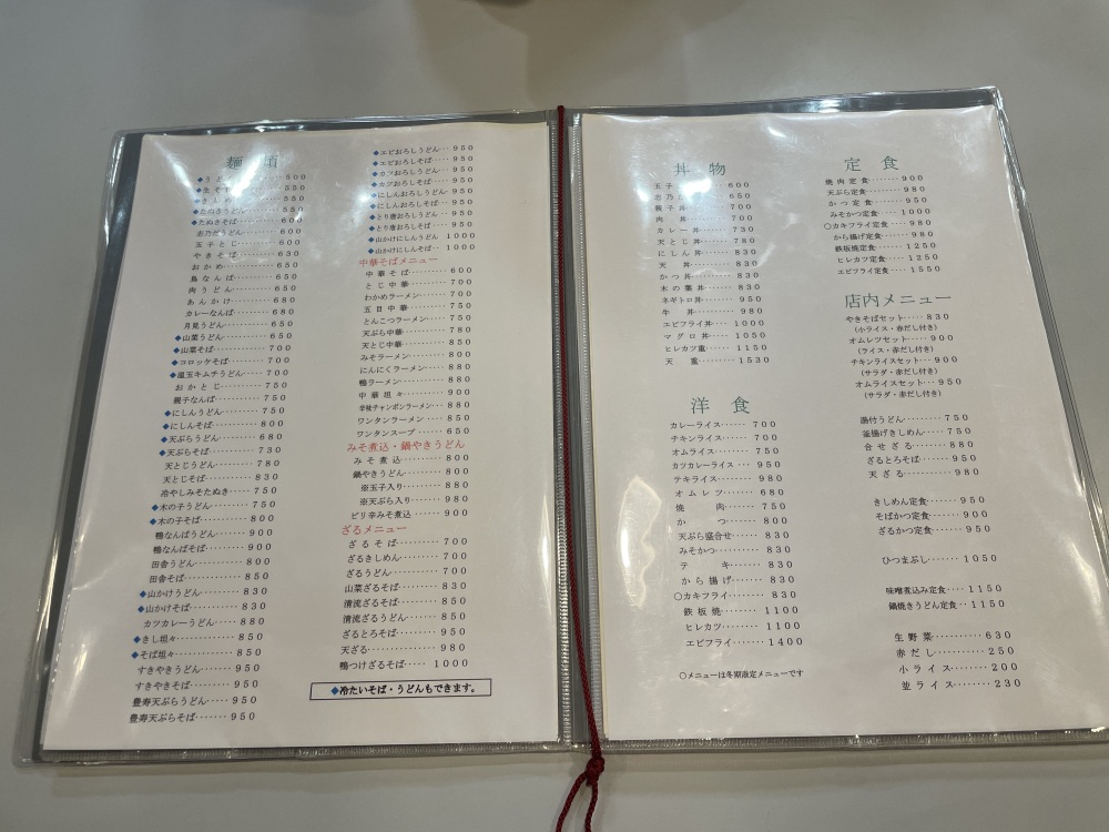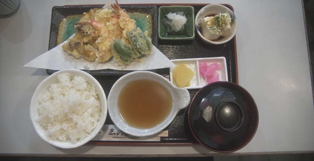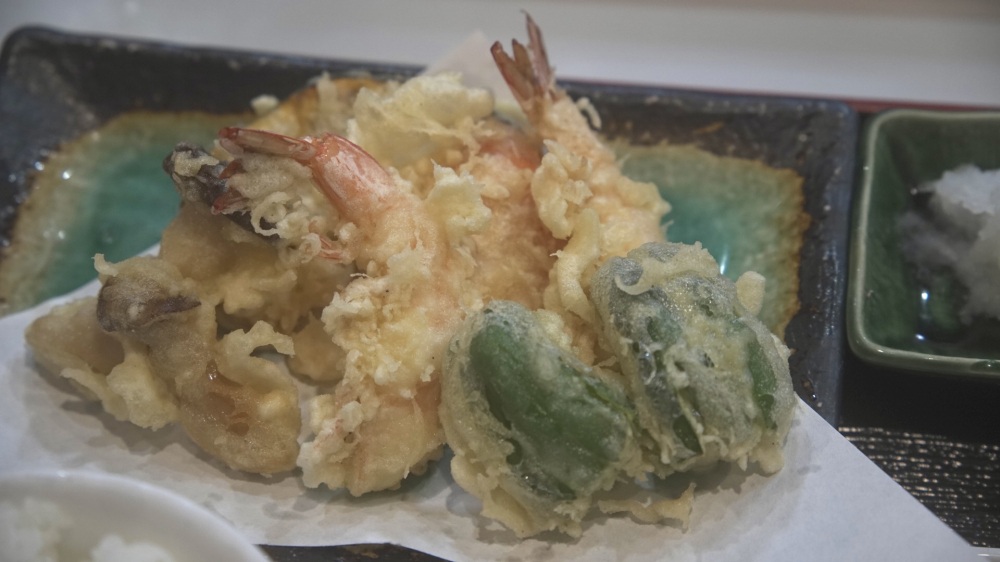 メニューを開いて種類の多さに驚き!すごくバラエティに富んでいます。この日選んだのは「天ぷら定食」で、海老や野菜の天ぷらに、冷やっこ、味噌汁付き。最高の組み合わせをいただきました。