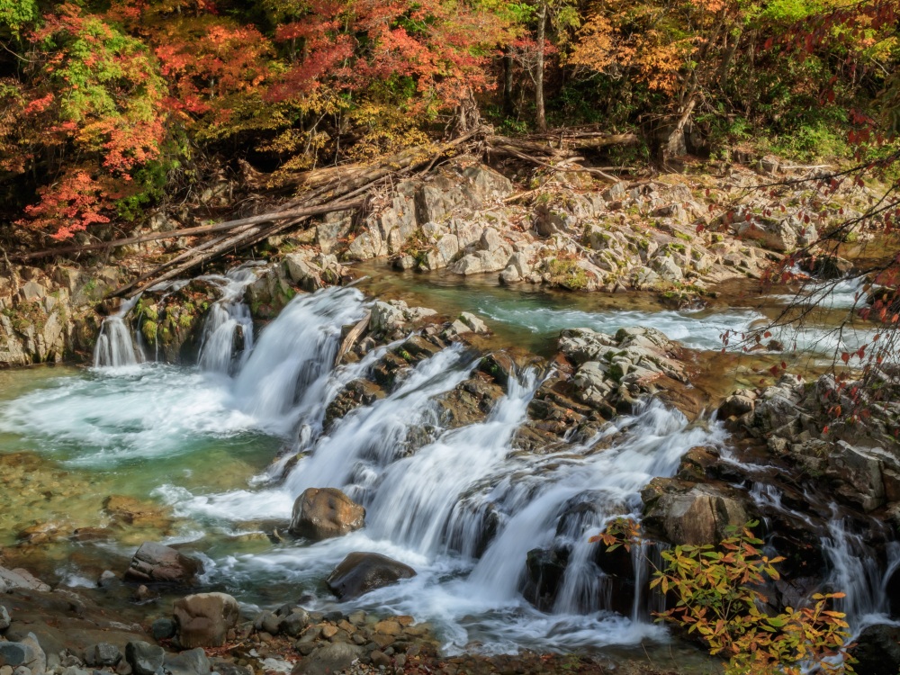 「宇津江四十八滝(うつえしじゅうはったき)」は紅葉の名所として知られており、「飛騨・美濃紅葉33選」に選ばれています。標高1,200mの滝上川を源として流れ出す四十八滝川には、大小無数の滝があり、秋には渓谷と紅葉の見事なコントラストを楽しめます。
