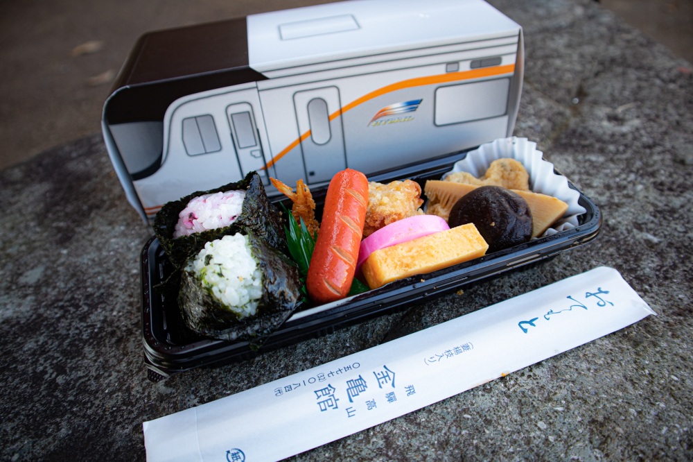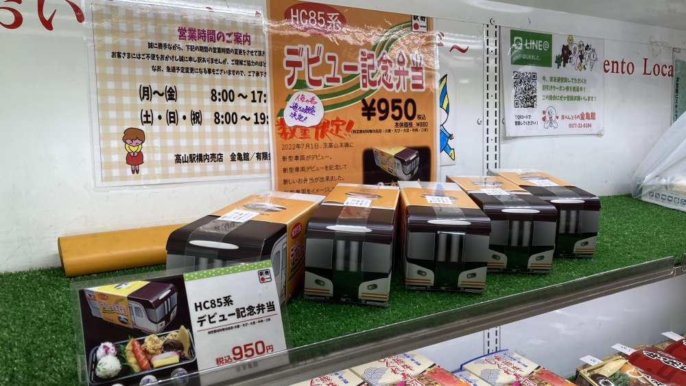 高山駅2階へ上がると、改札横に駅弁やお茶などを販売する「金亀館」があります。そこで息子が発見したのは、JR高山本線に2022年7月にデビューした新型車両(HC85系)をイメージした「デビュー記念弁当」。