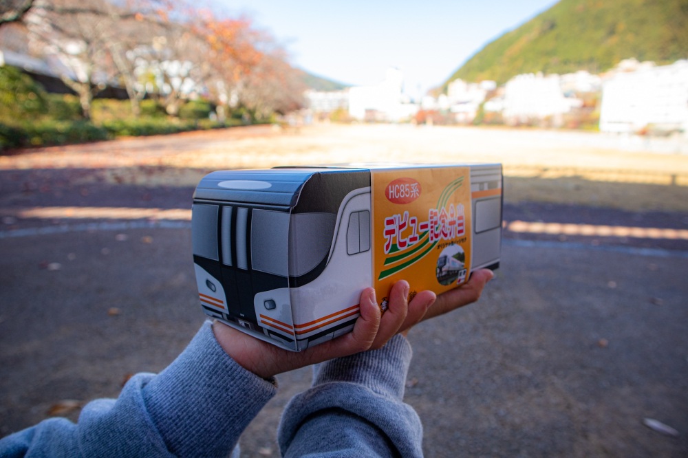 下呂で食べ歩きの予定も控えていましたが、「これも食べる!」とのことで、息子の分を購入しました。かっこいいデザインなので、子供たちや鉄道マニアにはたまらない一品だと思います。