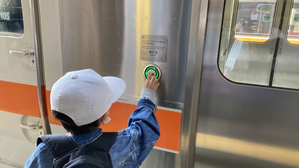 私「そのボタンを押してみて?」 息子「開いたー!!」 ワンマン列車が初めての息子には、自分で列車の扉を開ける方式は新鮮だったようです。