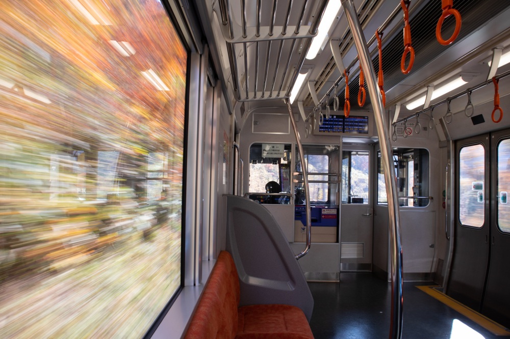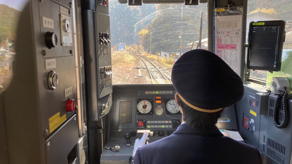 下呂駅までは1時間ほど。車窓からの美しい紅葉を眺めたり、運転手さんの仕事ぶりを見学したりしながら過ごします。