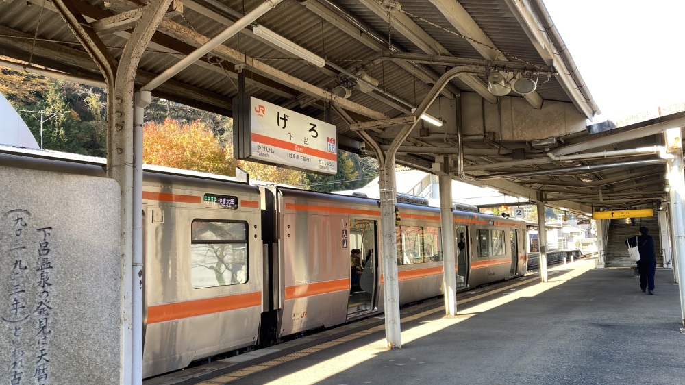 今回は私の地元、飛騨高山が出発地です。良く晴れた朝、「そうだ、列車で下呂へ行こう!」と思い立ち、秋深まる下呂温泉街へ息子とミニ旅行に行ってきました。高山駅をワンマン列車で出発すると、8つの駅を経由して約1時間で下呂駅に到着します(自家用車でも所要時間は同じくらいです)。