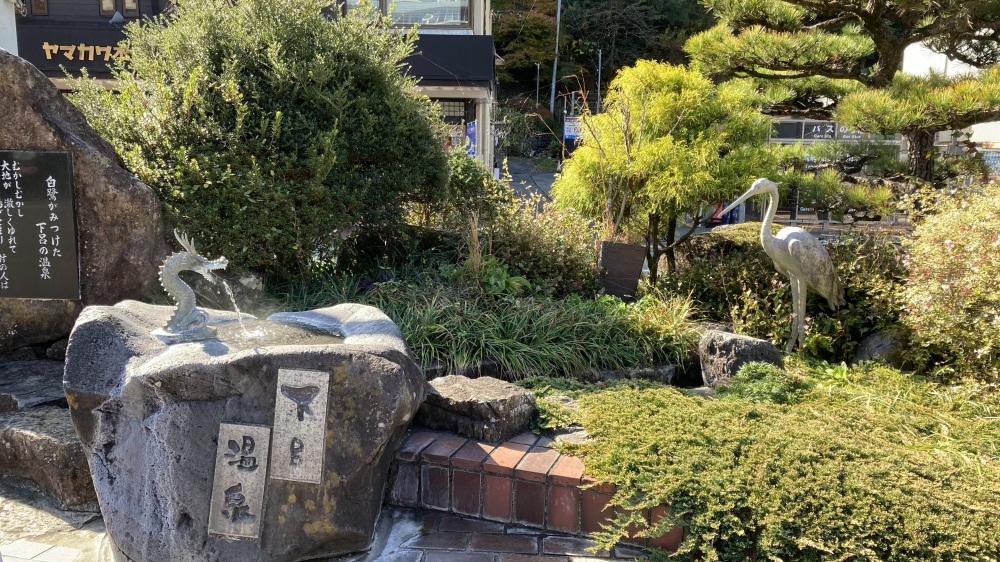 下呂駅に到着!まずは駅から徒歩5分の場所にある「噴泉池」へ向かいました。足湯目当てでしたが、人が多すぎて入れず…、ひとまず高山駅で購入した駅弁を食べることにしました。