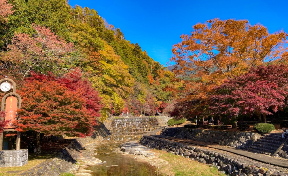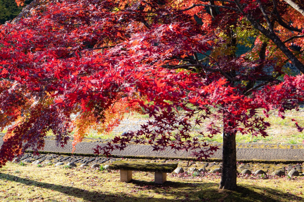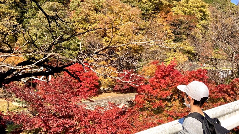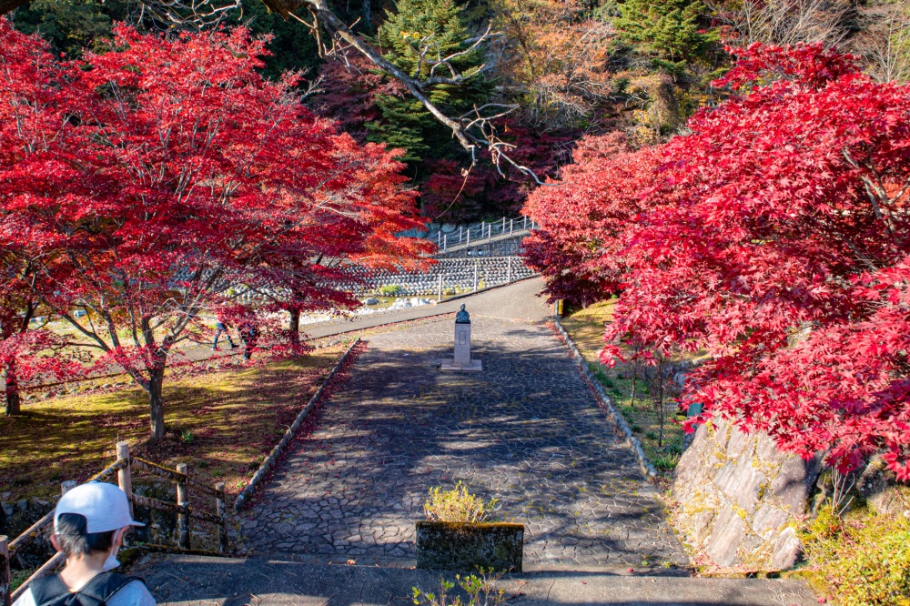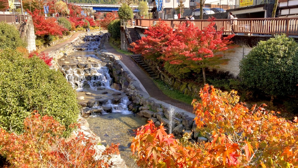 下呂駅側から、川に架かる大きな「下呂大橋」を渡り、まっすぐ坂を上っていくと、真っ赤に色づいたたくさんの紅葉が見えてきました。