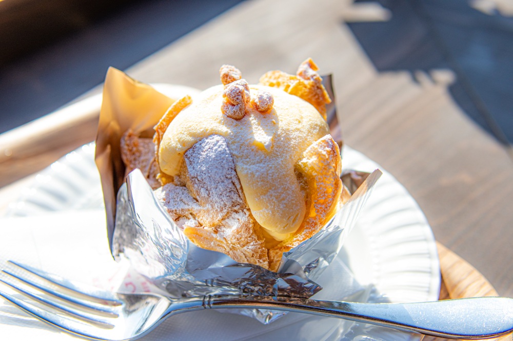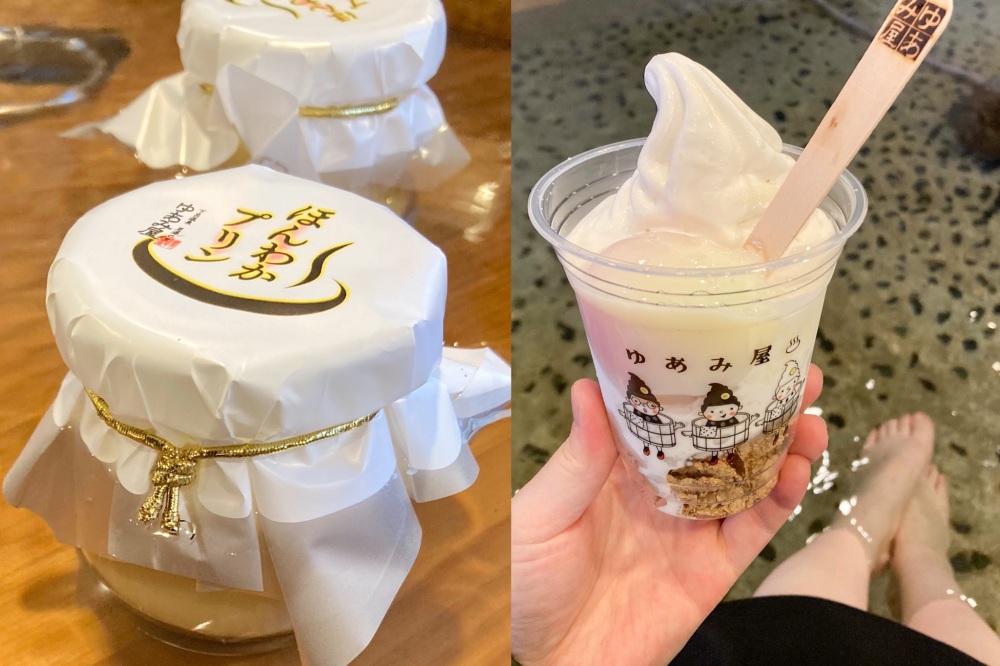 私も、足湯で温まりながら冷たい「温玉ソフト」を食べて、最高のリラックスタイムを堪能しました。桶で温めたとろーり食感の「ほんわかプリン」もおススメです!
