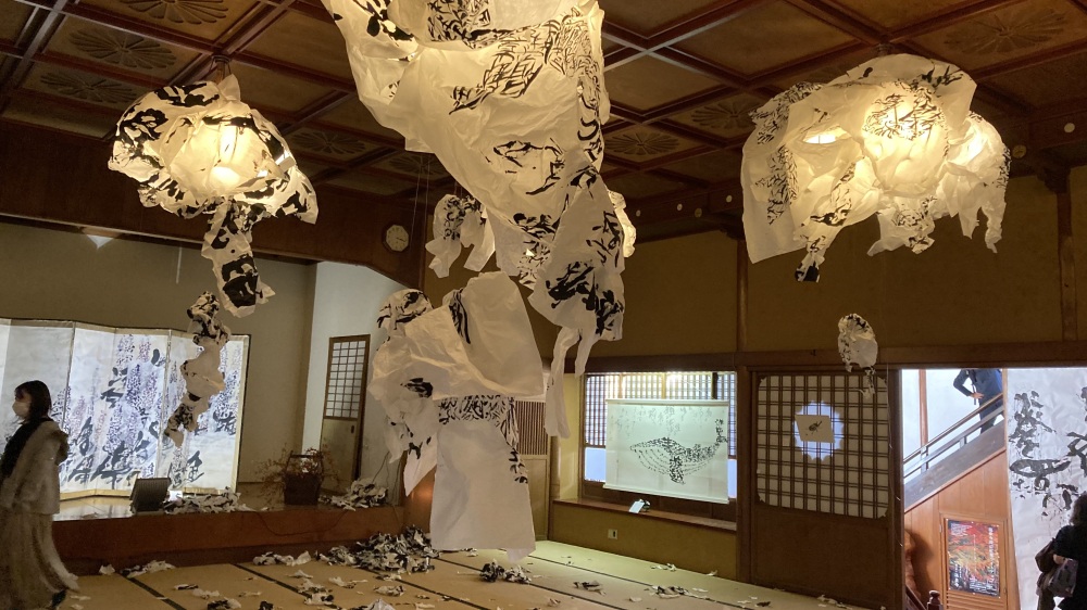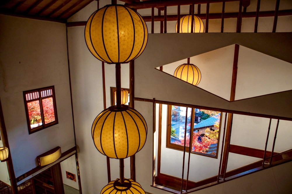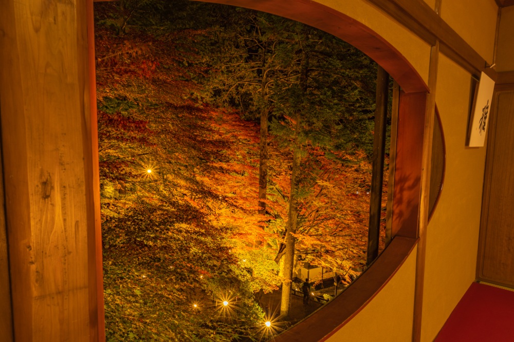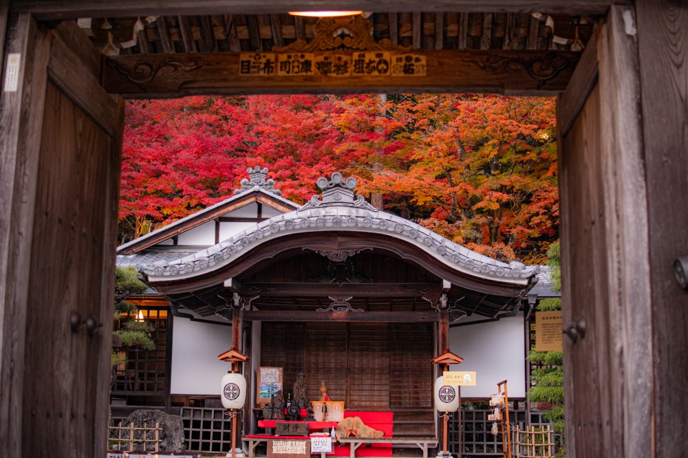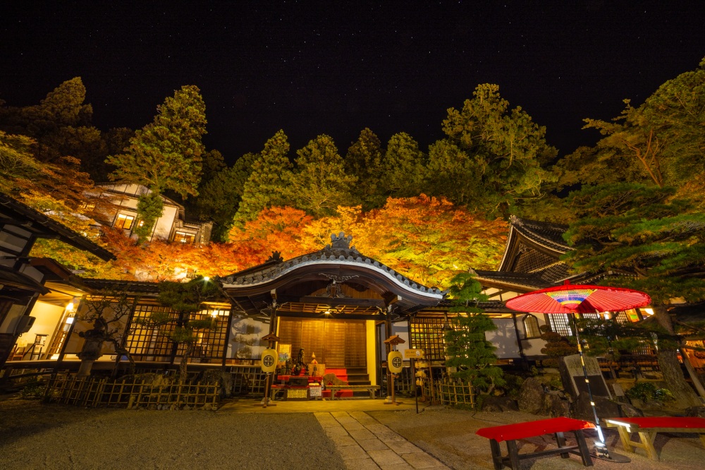夕方からはライトアップがあると聞き、一度高山へ戻ってから再度訪問。ライトアップされた紅葉の美しい光景に感動しました。温泉寺では随時さまざまなイベントが開催されており、この日は書展や写真展が開催されていました。