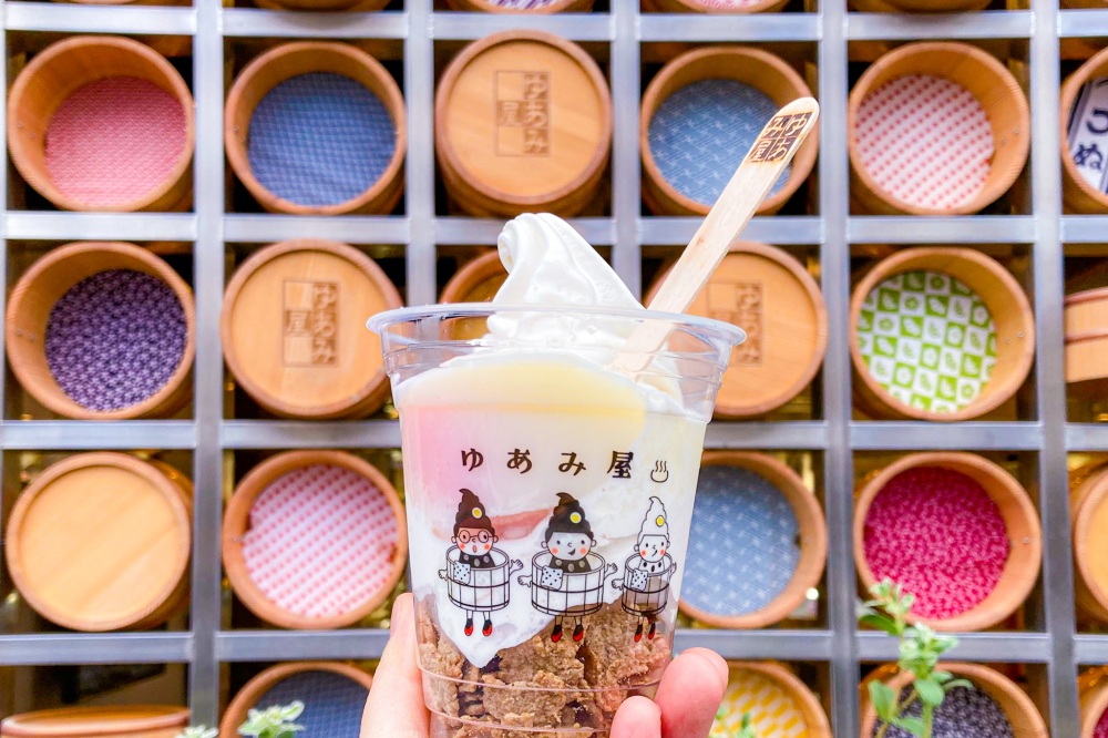 下呂温泉には、スイーツと足湯を同時に楽しめるお店があります。「下呂温泉足湯の里 ゆあみ屋」はソフトクリームに温泉卵が乗った「温玉ソフト」が1番人気!