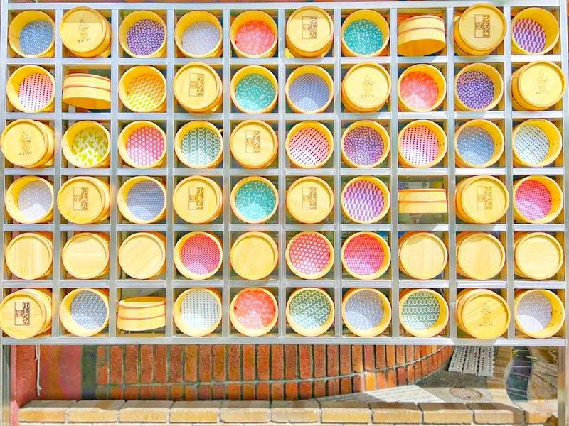 お店の入口には桶に様々な手ぬぐいを装飾したカラフルな桶の壁があり、映えスポットにもなっています。