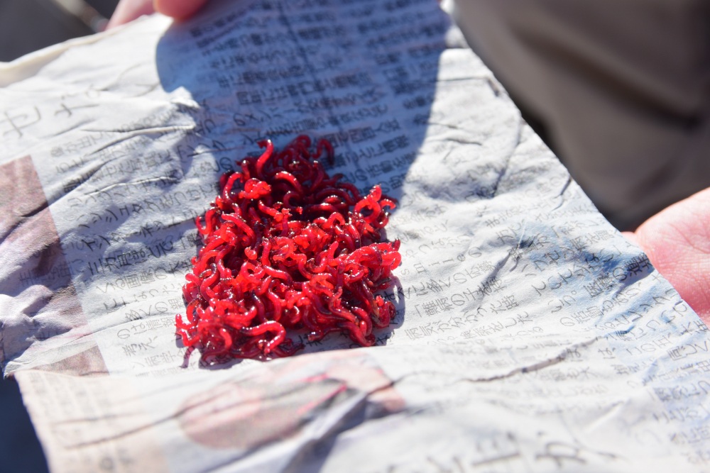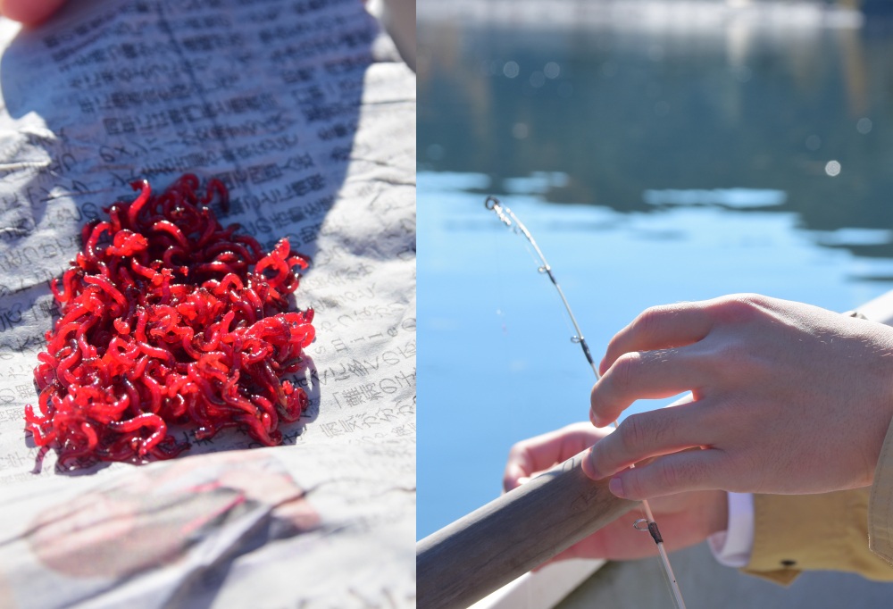 「ここだ!」と思うポイントに着いたら、用意された赤虫を付けて釣り糸の準備を始めます。釣り針は3連または6連で使えるものがレンタルできます。初心者はまずは3連から。慣れてきたら6連で釣るとより釣れるチャンスが上がります。