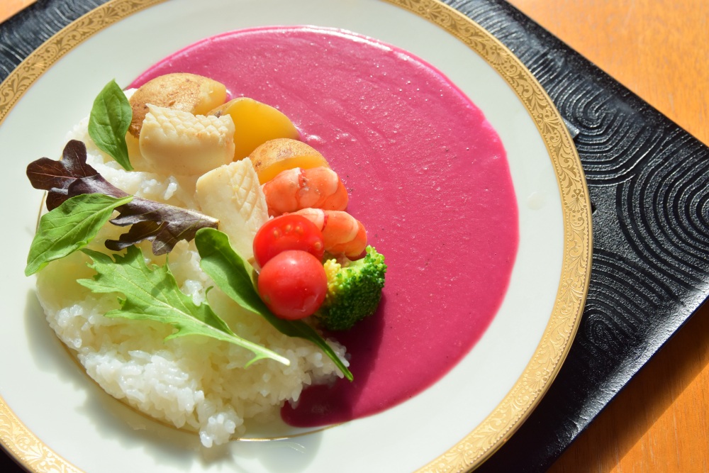 一つ目にご紹介するピンクメニューは「ピンクカレー」です。ピンクのルーの秘密は栄養食としても知られる「ビーツ」が使ってあること! ホワイトソースがベースになっており、海鮮スパイスをブレンドしてあります。見た目とは裏腹にとても自然で深い味わいになっているので、食べてみたらこれまたびっくりですよ!