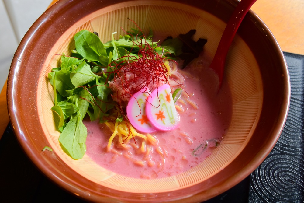 二つ目は「ピンクラーメン」。こちらもビーツで色付けしてあります。豆乳ベース&醤油味でまろやかな味わいが特徴。なんとネギトロも乗って、味に深みが出してあります。