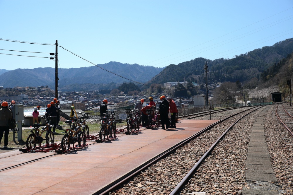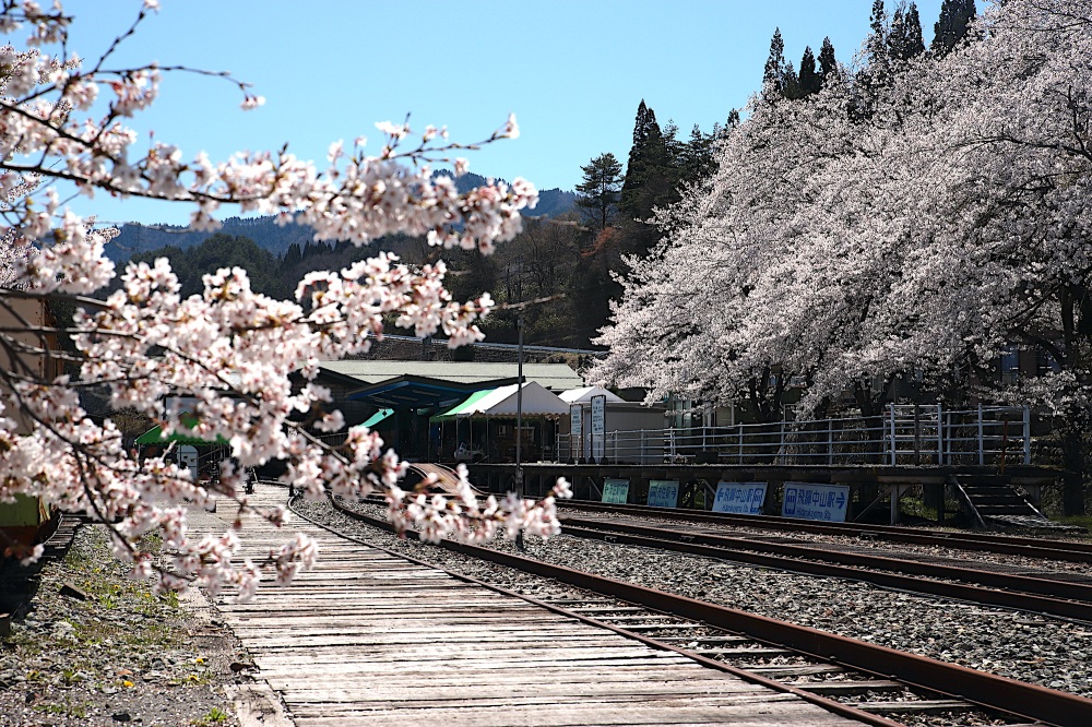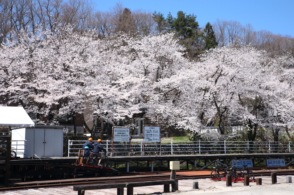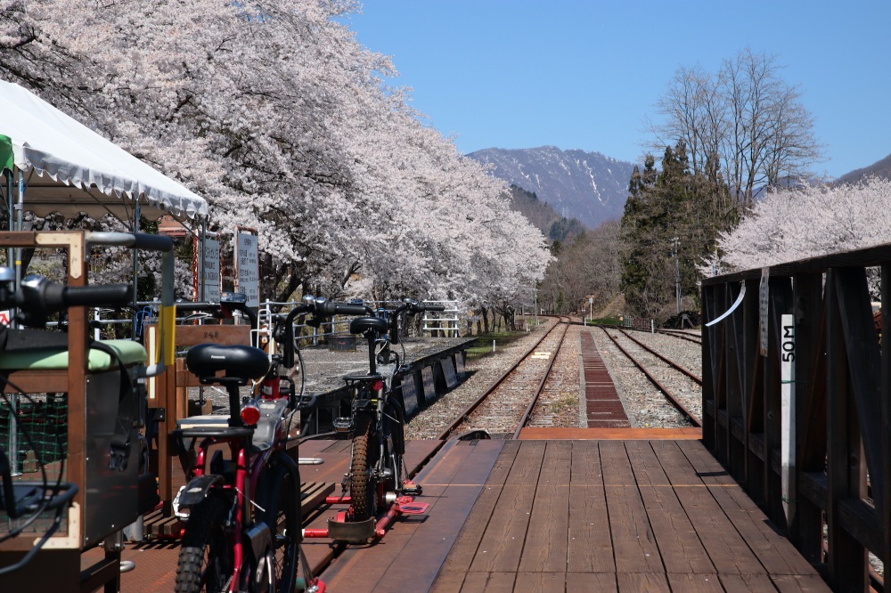 2つのコースがあるのですが、このうちまちなかコースの出発駅となる「奥飛騨温泉口駅」は、地元ではよく知られた桜名所です。1年のうち、3月末〜4月中旬まで、桜の風景に心洗われる廃線サイクリングを楽しめます。