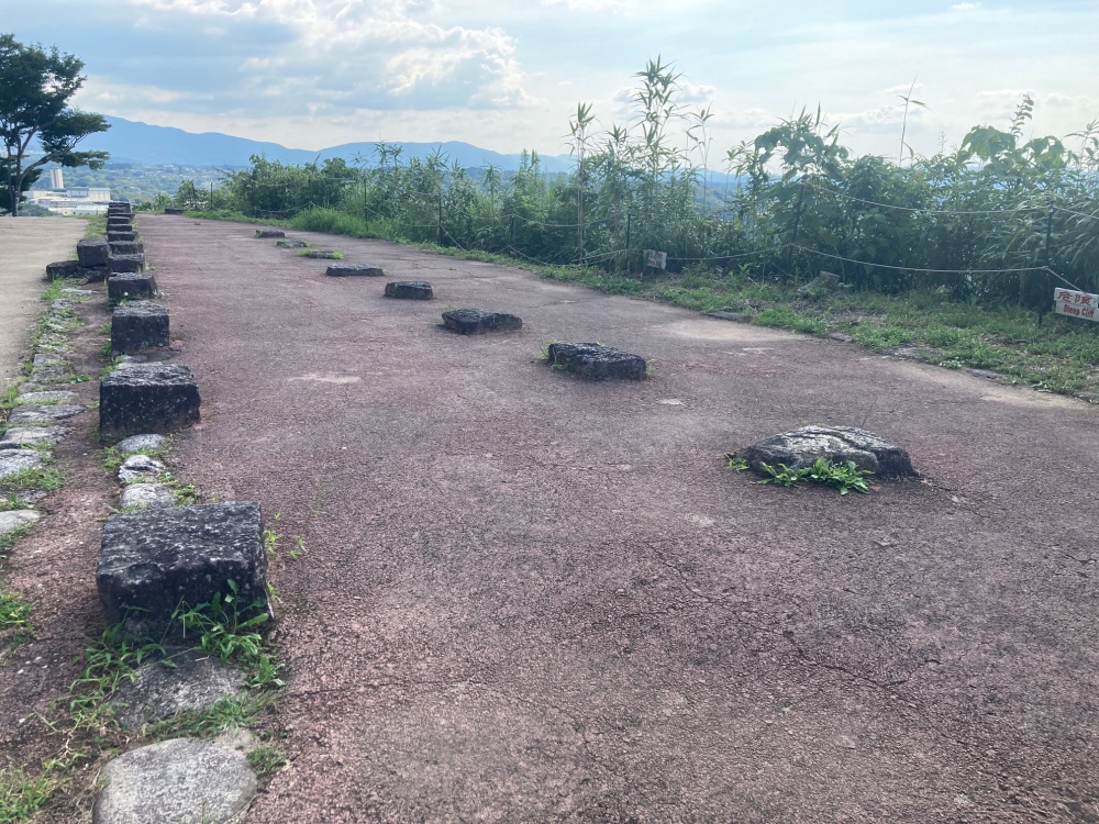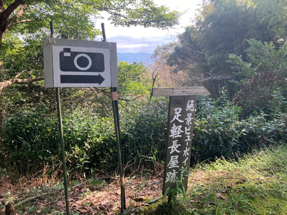 城跡の入り口の右手にある足軽長屋跡。かつて足軽の長屋(詰所)があった場所ですが、ここから見上げる苗木城跡は絶景!