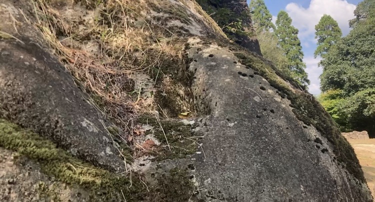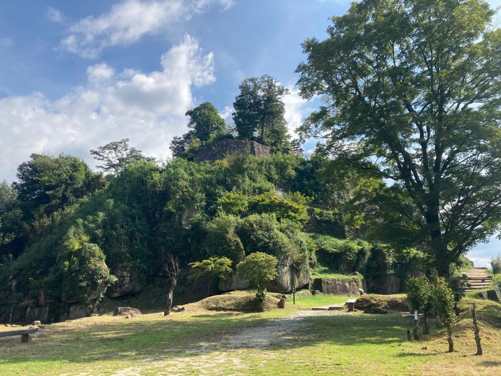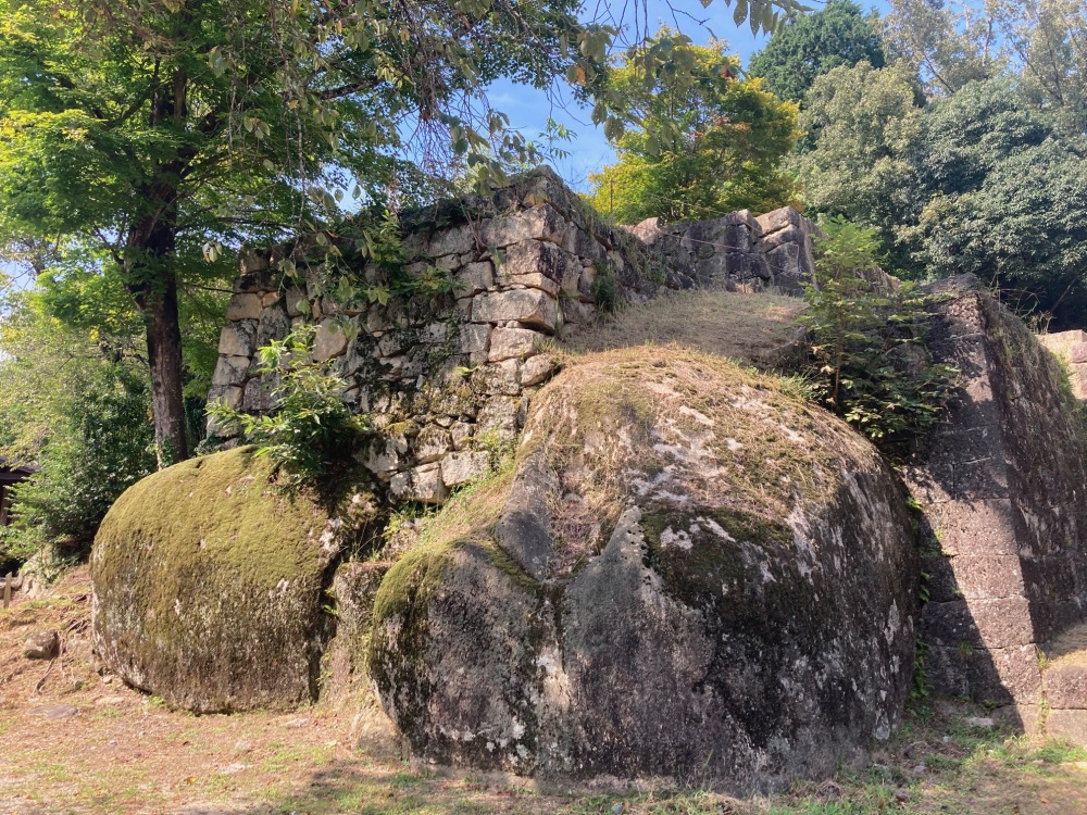 三の丸に辿りつくと、まず目に飛び込んでくるのが古代遺跡を思わせるような石垣群です。こちらは、3階建ての大きな矢倉なのですが、注目して見てほしいのは岩盤とコラボレーションした石垣。なんと、自然の巨岩を基盤にしながら人口の石垣が積まれていて、迫力満点です。